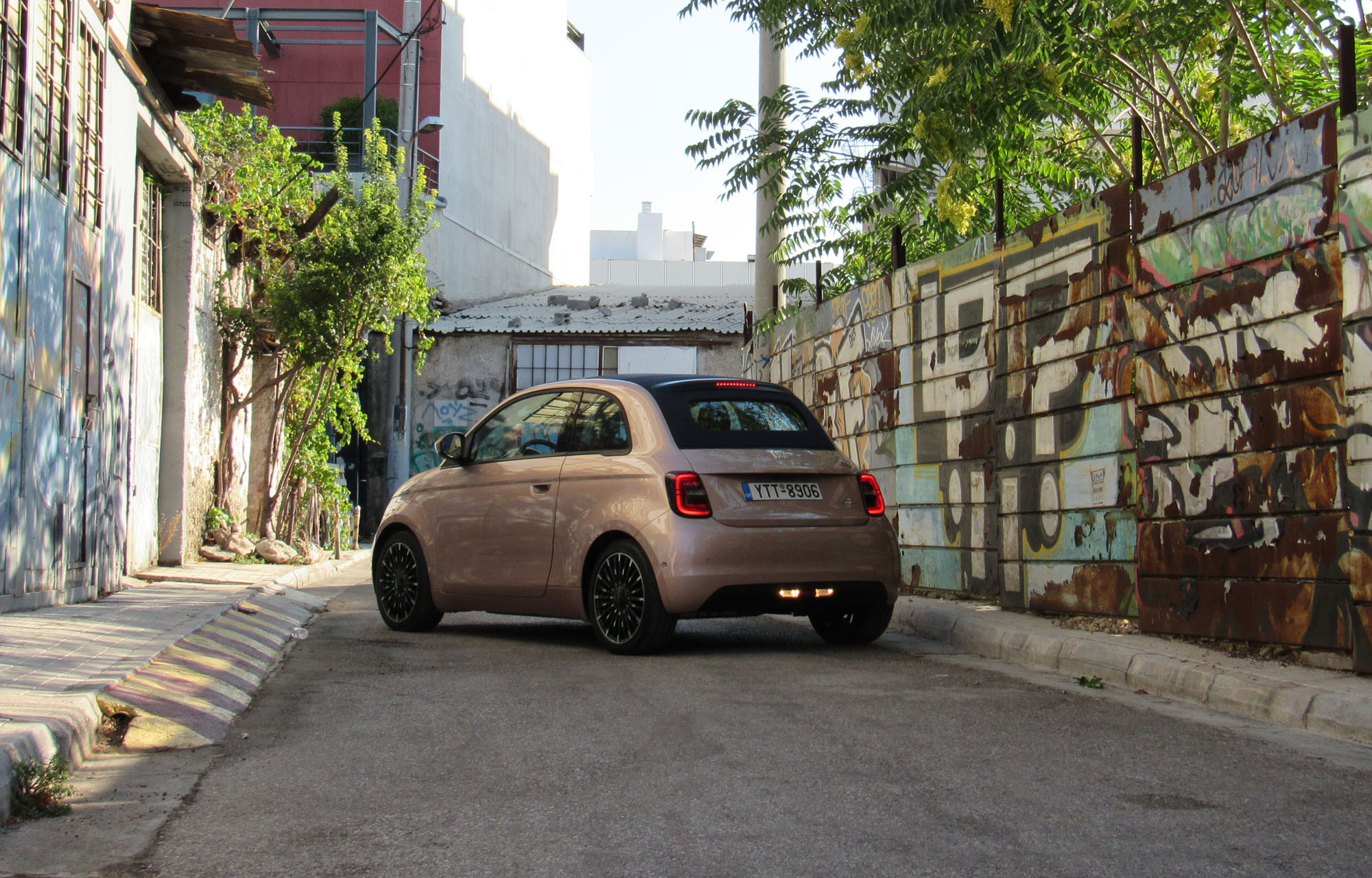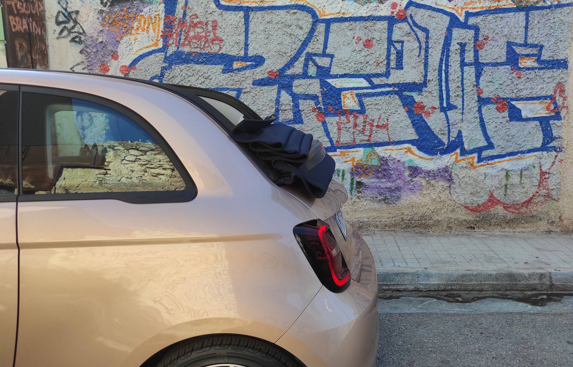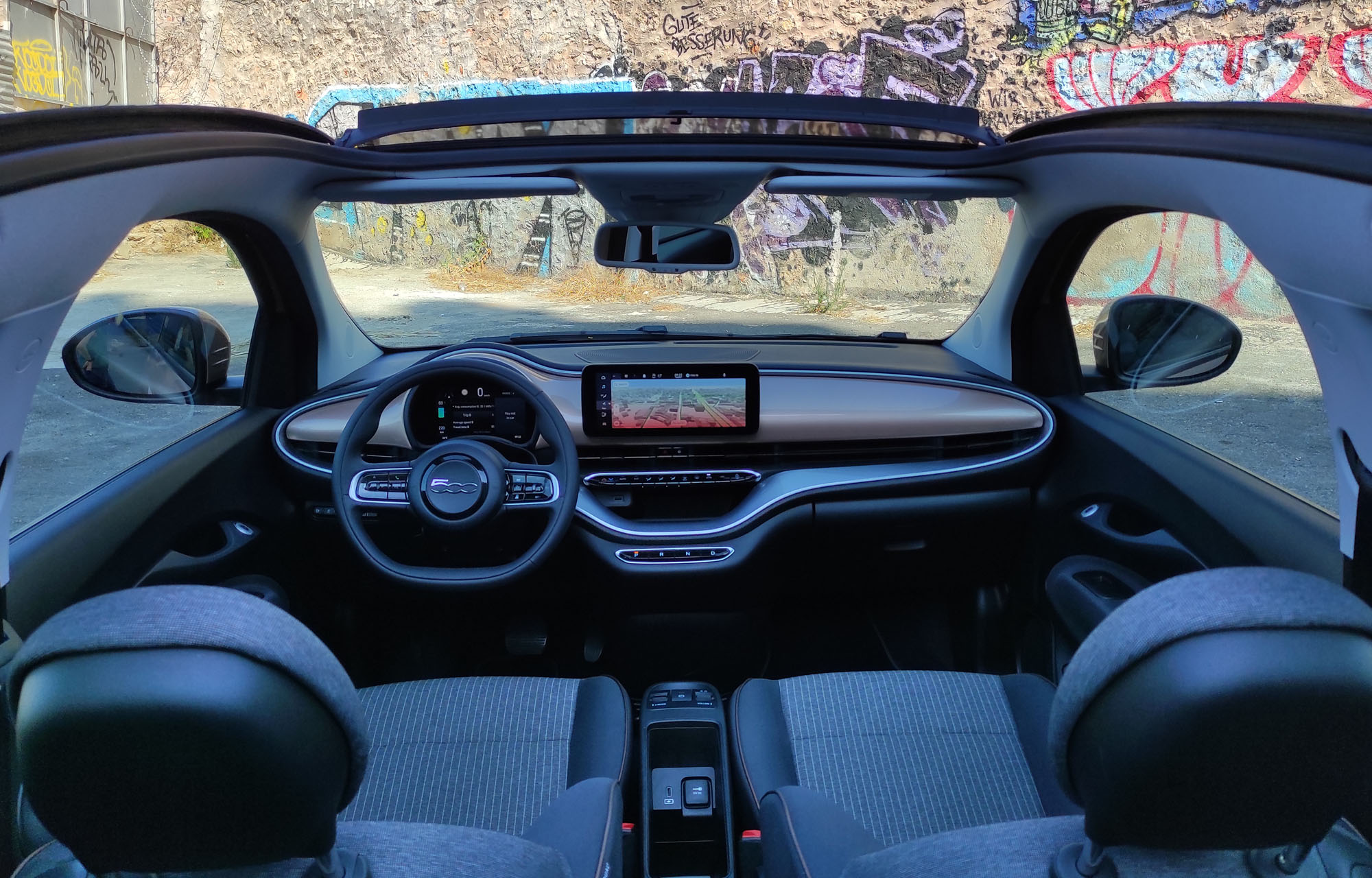 Επιπλέον, οι χειρολαβές είναι χωνευτές και ανοίγουν ηλεκτρικά, με μπουτόν. Πίσω η εικόνα είναι περισσότερο γνώριμη, με το σήμα της Fiat να είναι τοποθετημένο στο κέντρο της μικρή πόρτας του χώρου αποσκευών και το 500 λίγο πιο κάτω και δεξιά δίπλα από το ανάγλυφο φωτιστικό σώμα. Αυτό όμως που κάνει ακόμα πιο ξεχωριστό το 500αράκι της δοκιμής μας είναι η οροφή του. Υφασμάτινη για την περίπτωση του cabrio, που ανοίγει ηλεκτρικά. Μπορεί να παίξει το ρόλο της ηλιοροφής, ανοίγοντας μέχρι τη μέση ή ολόκληρη μέχρι πίσω, αποκαλύπτοντας έτσι το στιλάτο εσωτερικό του.