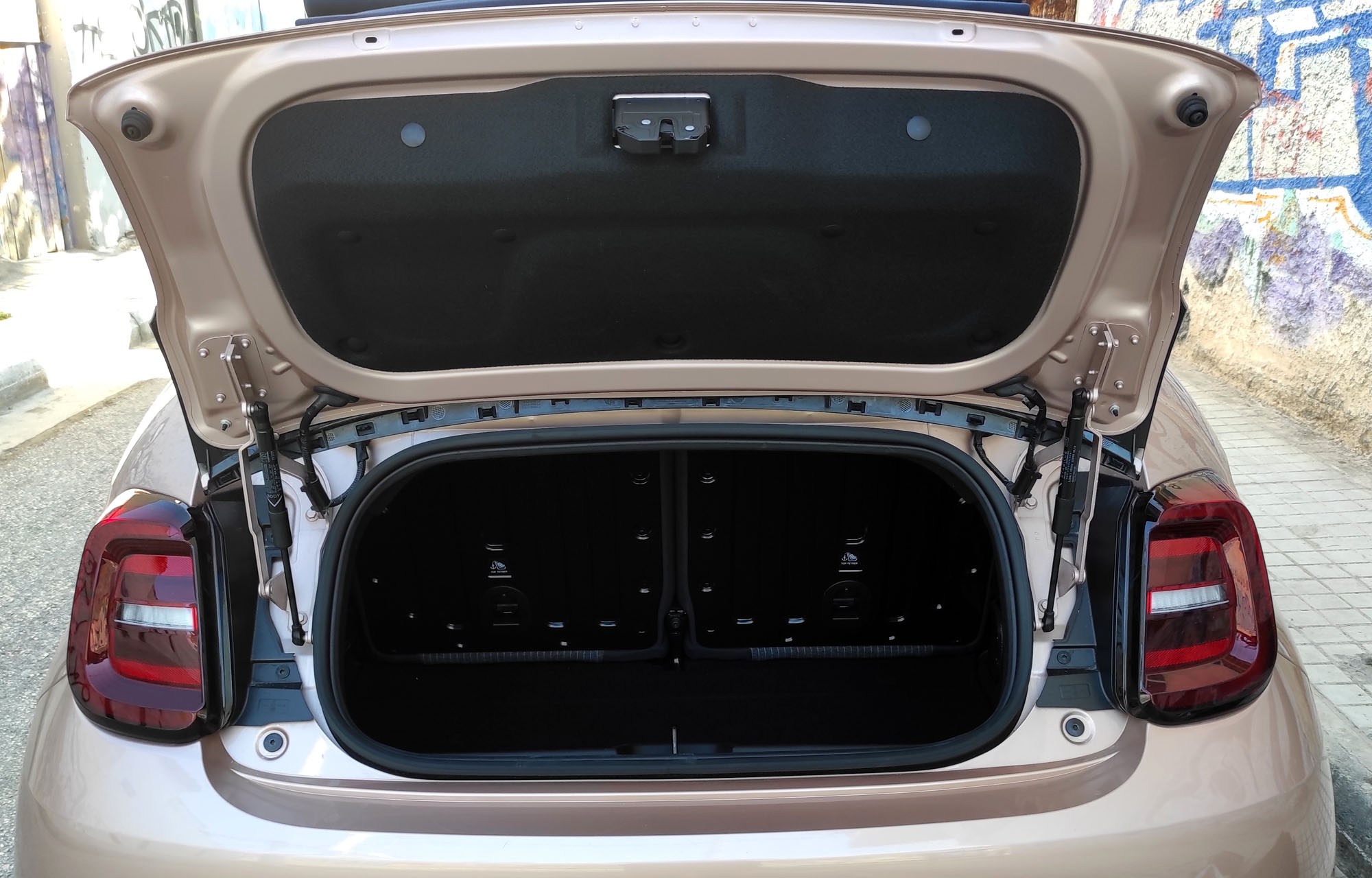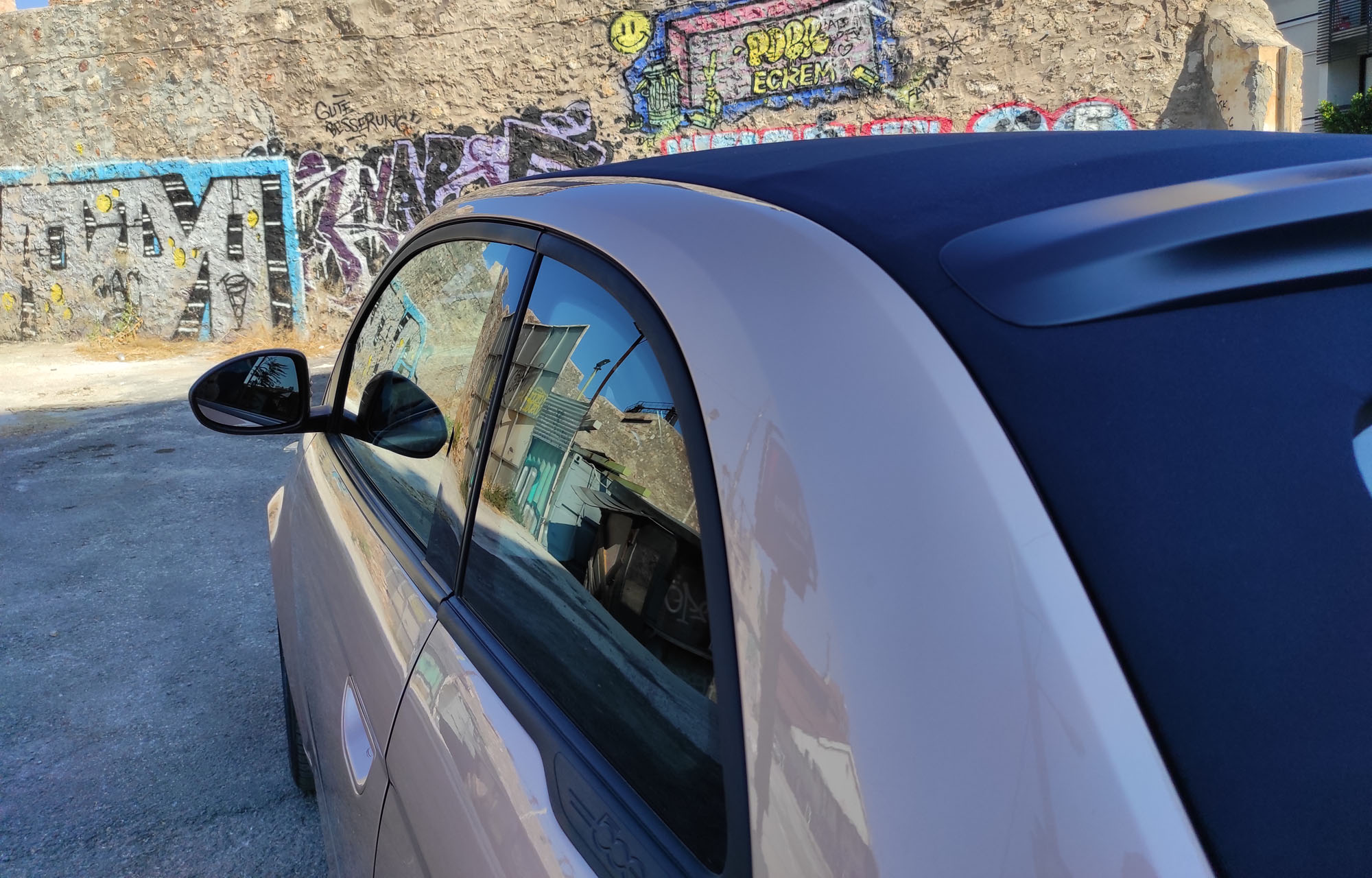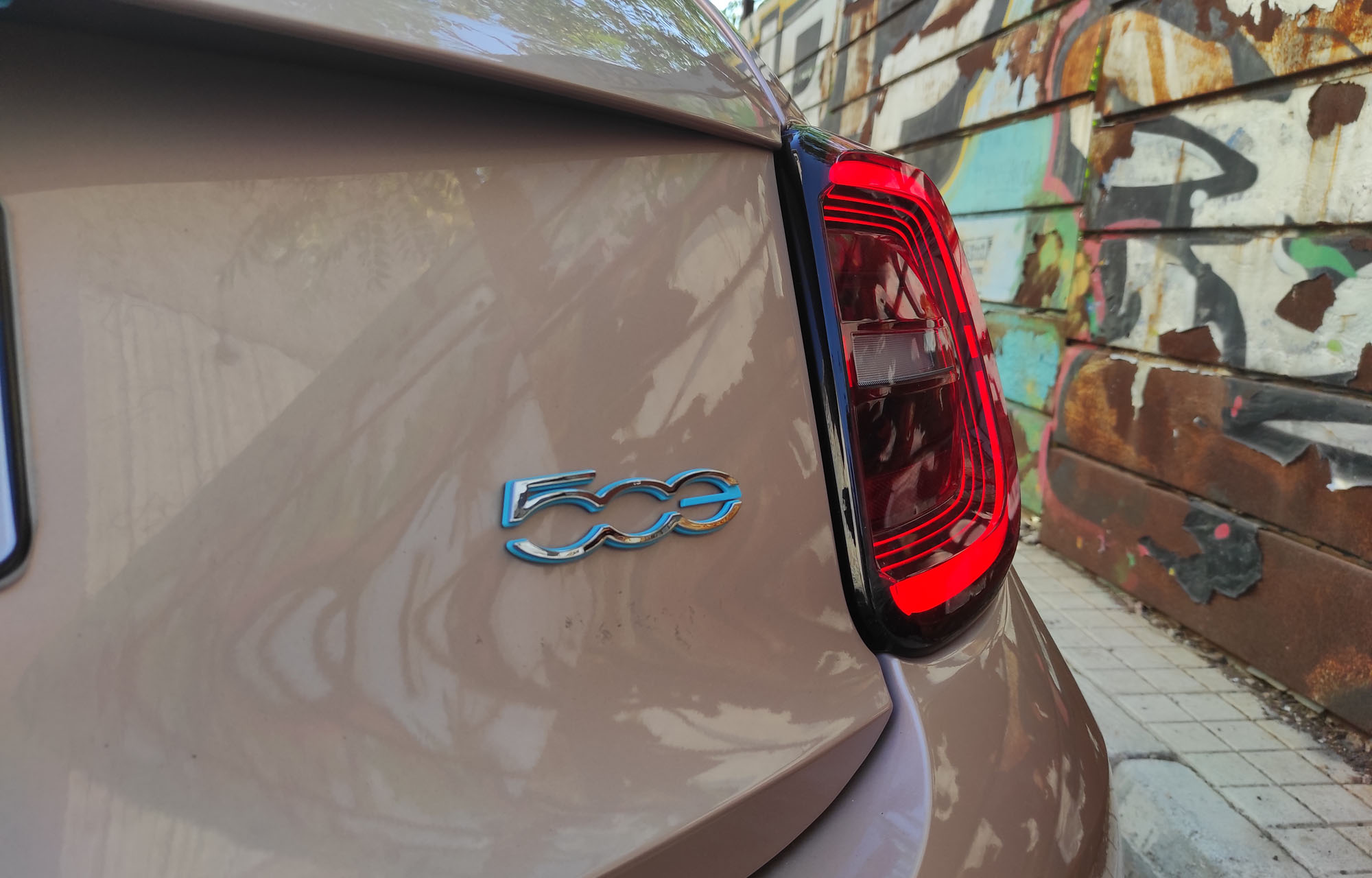 Επιπλέον, οι χειρολαβές είναι χωνευτές και ανοίγουν ηλεκτρικά, με μπουτόν. Πίσω η εικόνα είναι περισσότερο γνώριμη, με το σήμα της Fiat να είναι τοποθετημένο στο κέντρο της μικρή πόρτας του χώρου αποσκευών και το 500 λίγο πιο κάτω και δεξιά δίπλα από το ανάγλυφο φωτιστικό σώμα. Αυτό όμως που κάνει ακόμα πιο ξεχωριστό το 500αράκι της δοκιμής μας είναι η οροφή του. Υφασμάτινη για την περίπτωση του cabrio, που ανοίγει ηλεκτρικά. Μπορεί να παίξει το ρόλο της ηλιοροφής, ανοίγοντας μέχρι τη μέση ή ολόκληρη μέχρι πίσω, αποκαλύπτοντας έτσι το στιλάτο εσωτερικό του.
