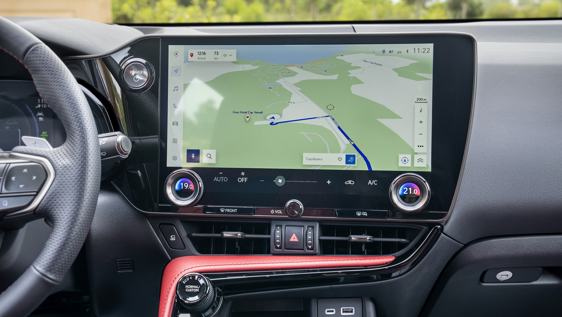 Εξαιρετικό είναι το σύστημα απεικόνισης του περιβάλλοντα εξωτερικού χώρου μέσα από τις περιμετρικές κάμερες που διαθέτει το NX 450h+. Πέρα από την κάμερα οπισθοπορείας και την οπτική 360 μοιρών, προσφέρεται και απεικόνιση από το κέντρο του δαπέδου του αυτοκινήτου, που δείχνει πού ακριβώς βρίσκονται οι τροχοί, κάτι που είναι εξαιρετικά χρήσιμο σε στενούς χώρους στάθμευσης, για να μην ακουμπήσουν τα λάστιχα το πεζοδρόμιο κατά το παρκάρισμα ή για να βλέπετε «που πατάνε» οι τροχοί στην εκτός δρόμου οδήγηση.