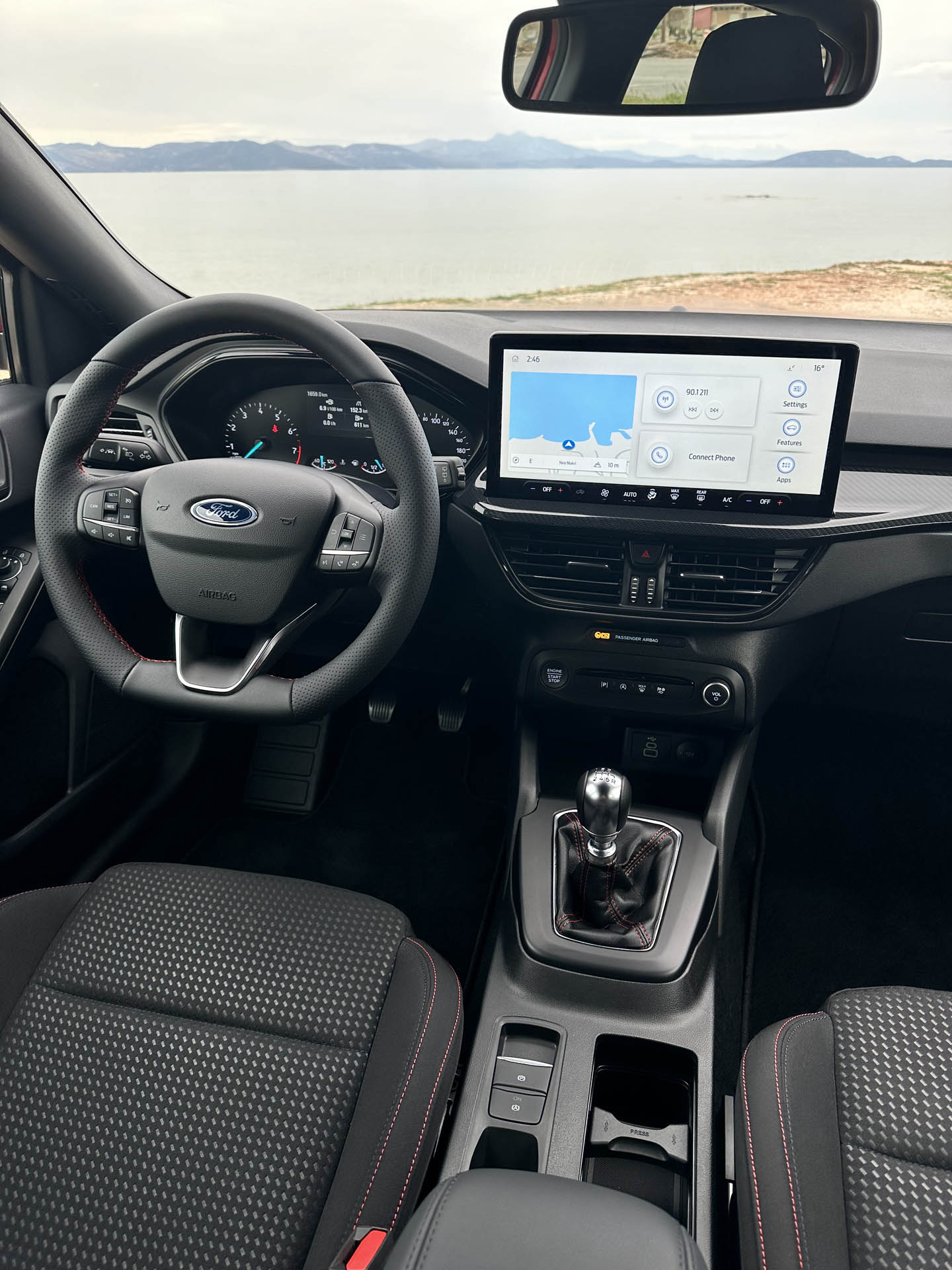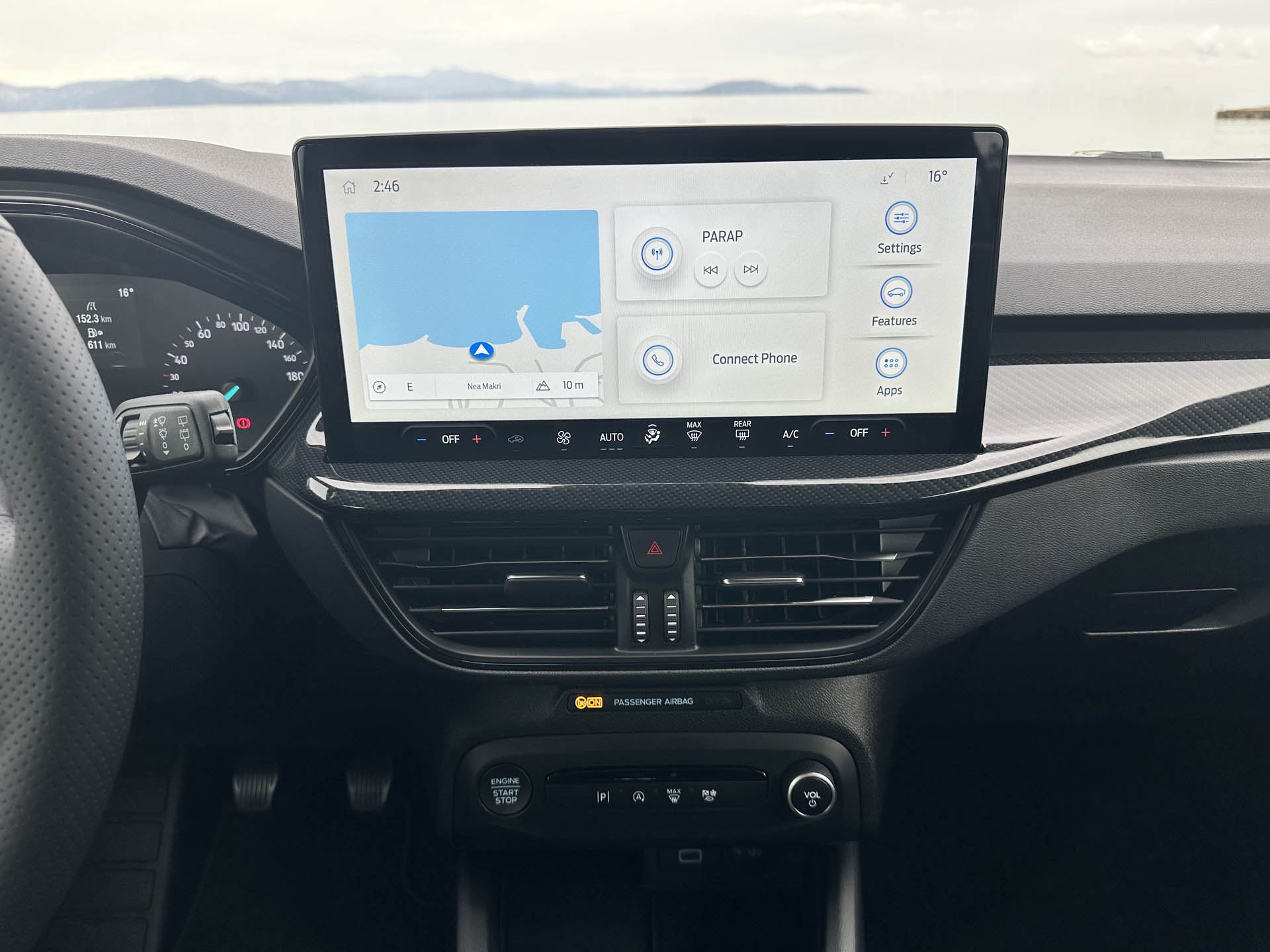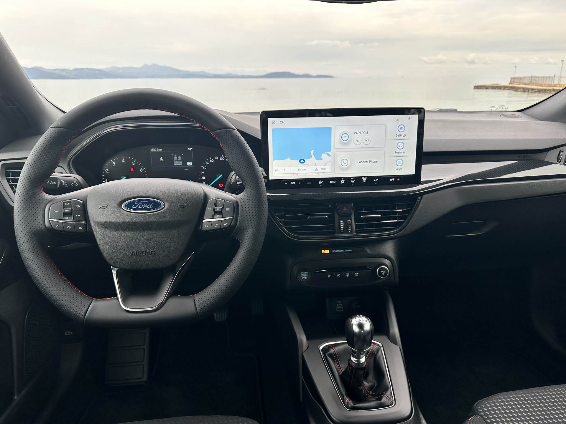 Η μεγαλύτερη διαφορά του ανανεωμένου Focus είναι η προσθήκη μεγάλης κεντρικής οθόνης αφής 13,2 ιντσών, με ασύρματο Apple CarPlay και Android Auto, που λειτουργεί άψογα. Το λογισμικό του συστήματος infotainment είναι ικανοποιητικό, ενώ η ασύρματη σύνδεση είναι απρόσκοπτη.