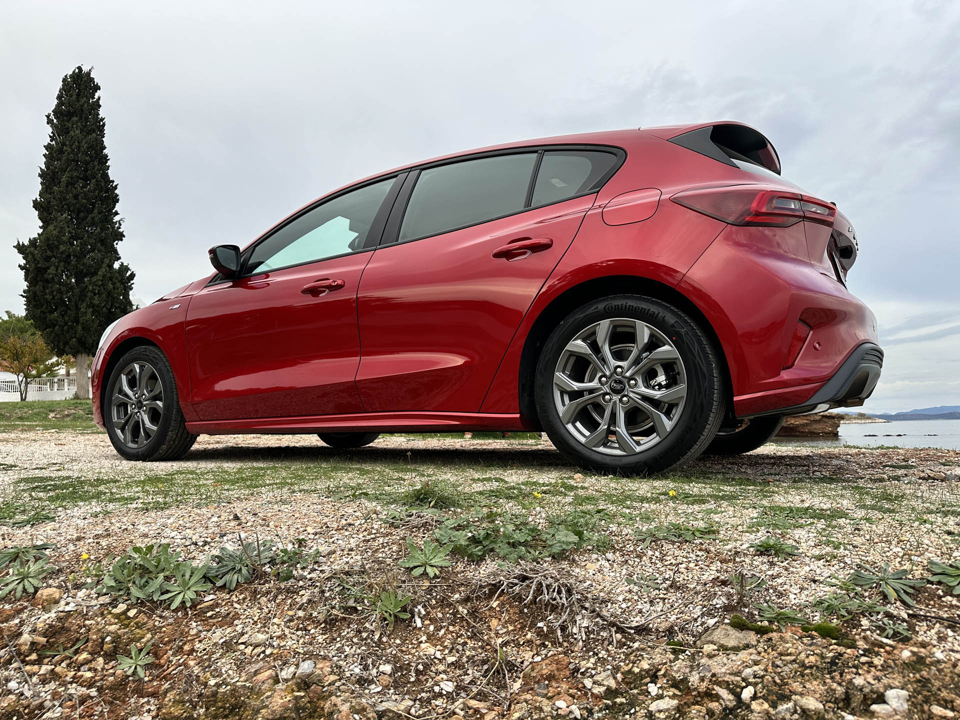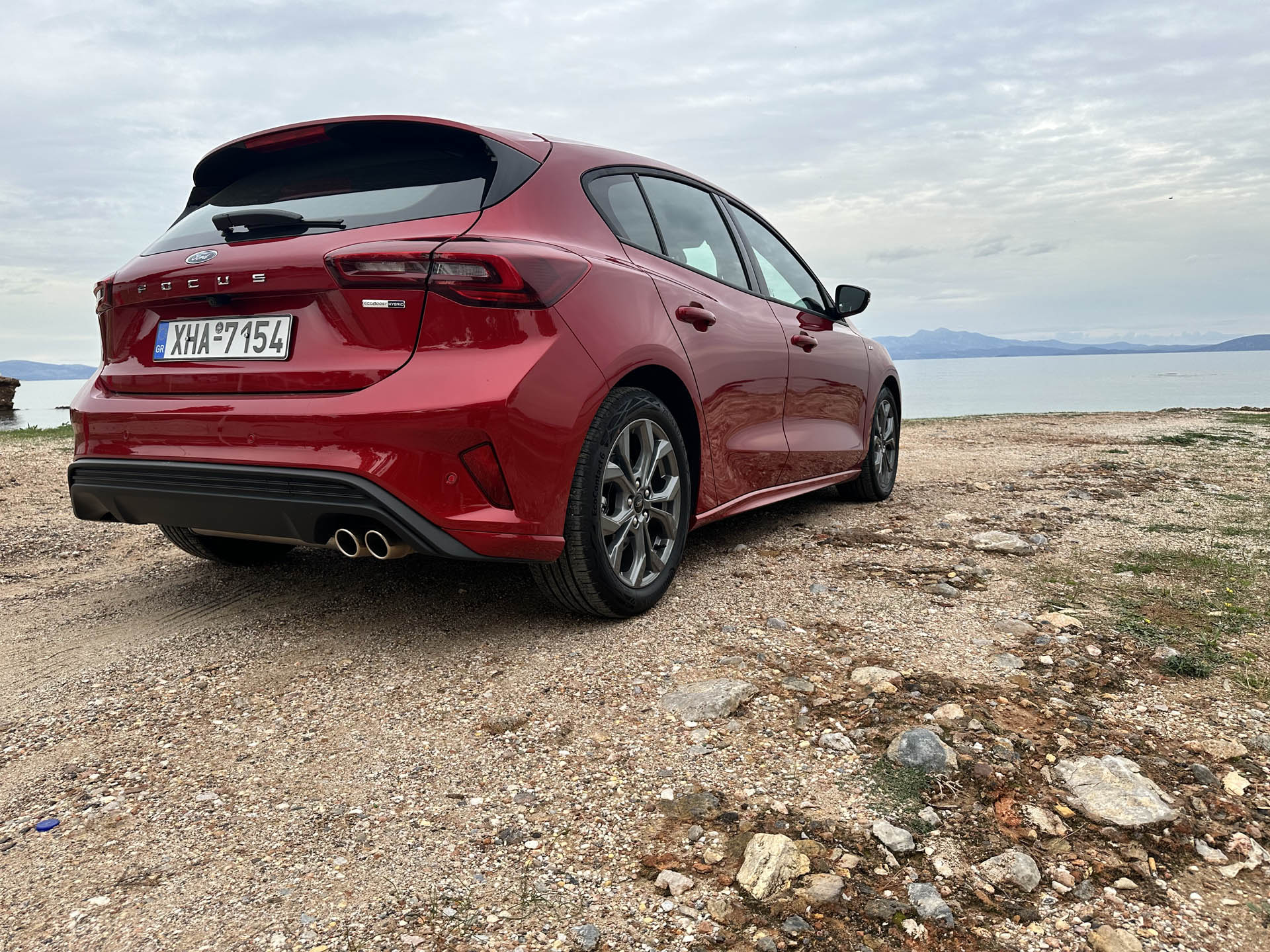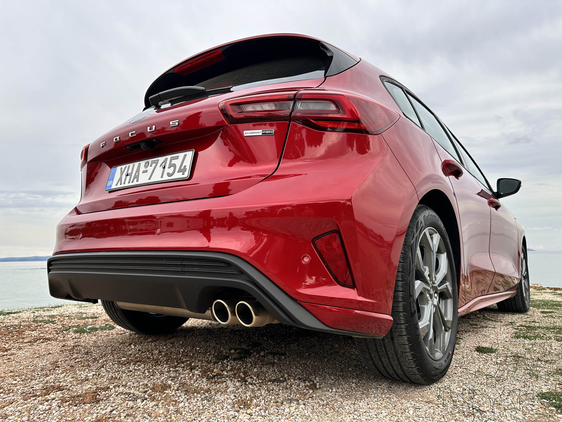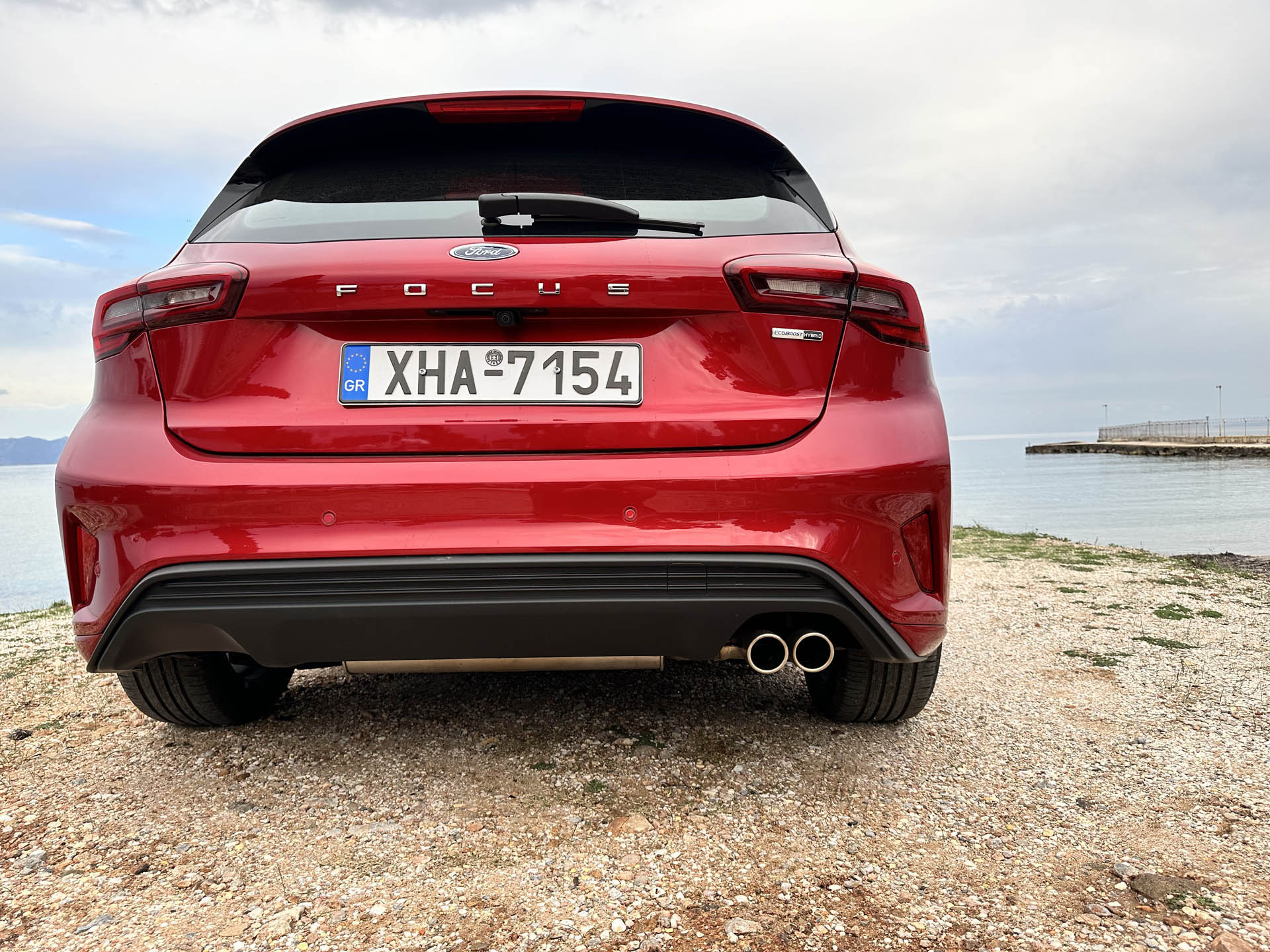 Στη σπορ όψη συμβάλλουν στο προφίλ οι πλαϊνές ποδιές, και στο πίσω μέρος η αεροτομή, ο διαχύτης και η χρωμιωμένη διπλή απόληξη εξάτμισηςΣήματα ST-Line στα εμπρός φτερά συμπληρώνουν το σκηνικό, με φόντο το μεταλλικό χρώμα «Fantastic Red» του αυτοκινήτου της δοκιμής, το οποίο κολακεύει τις γραμμές του Focus.