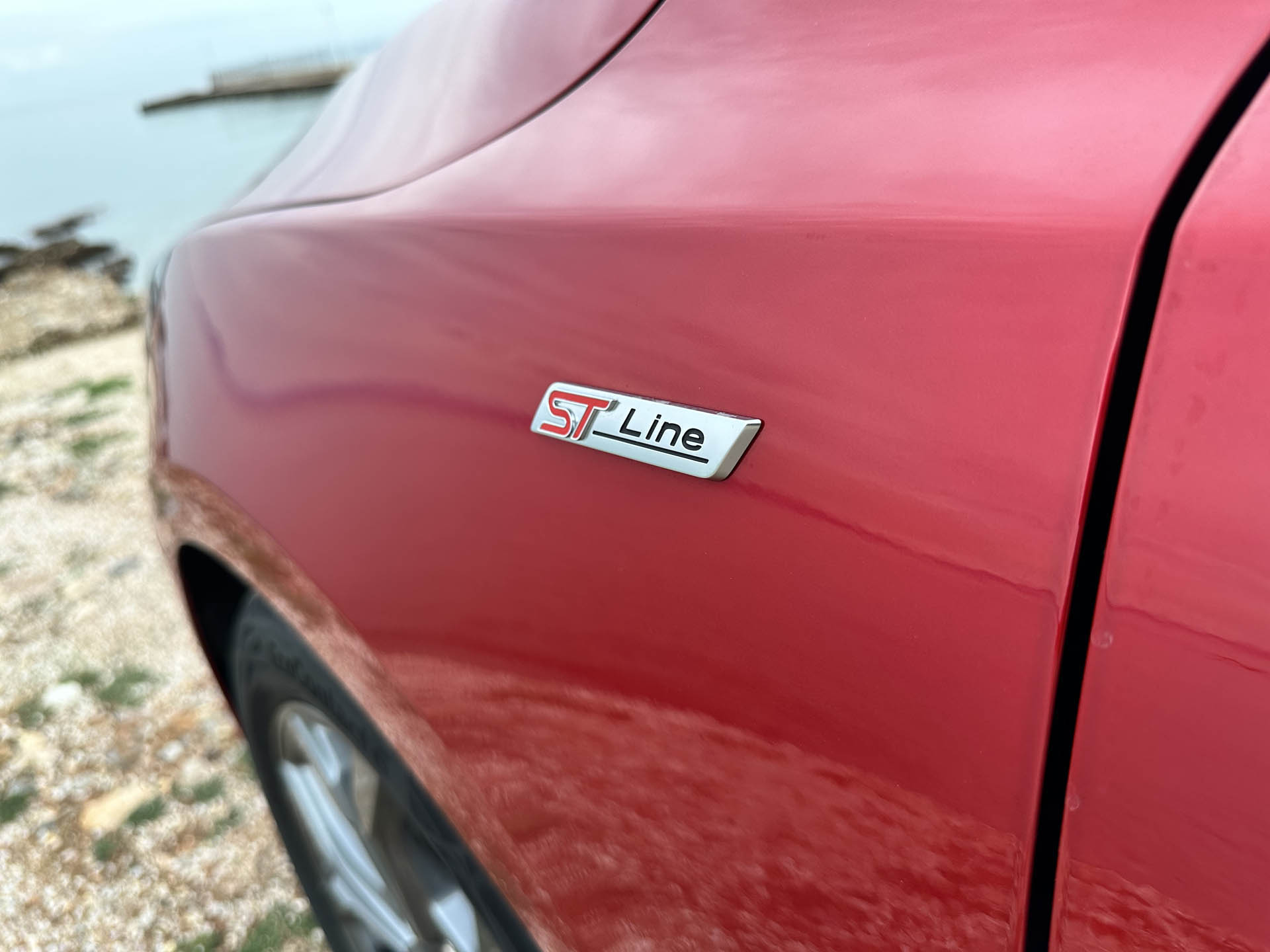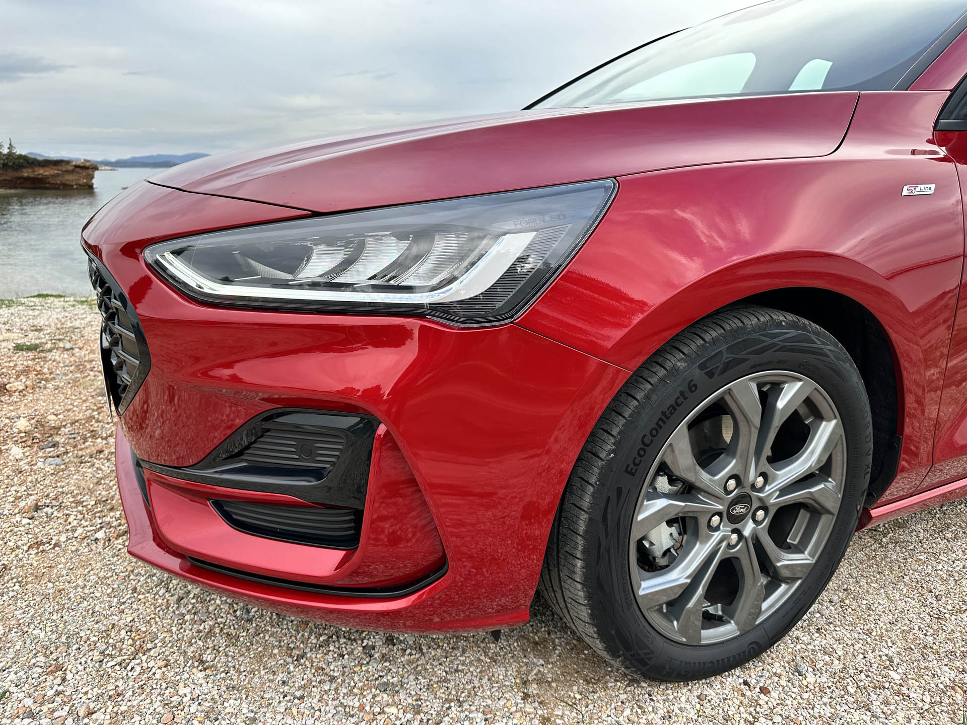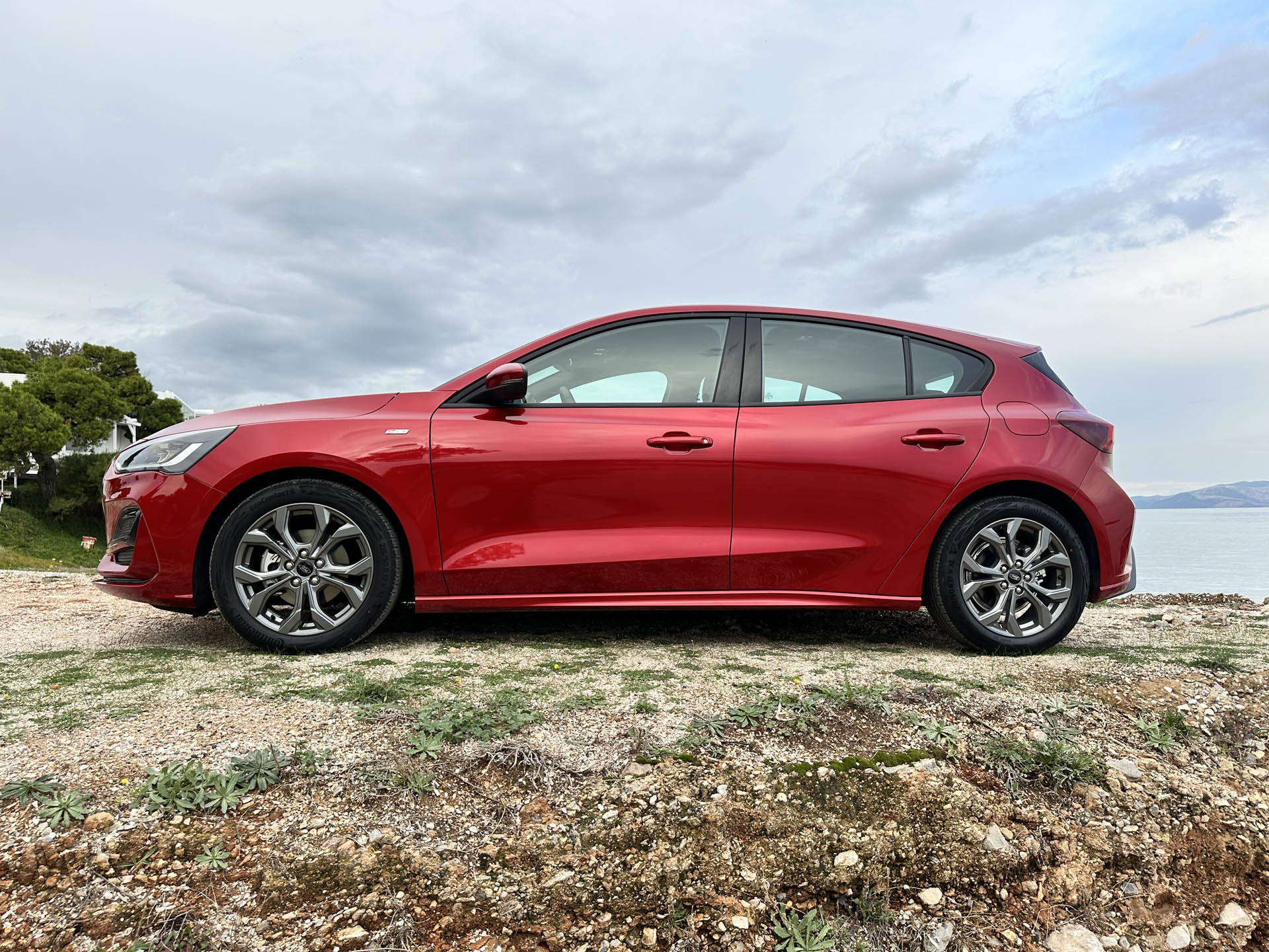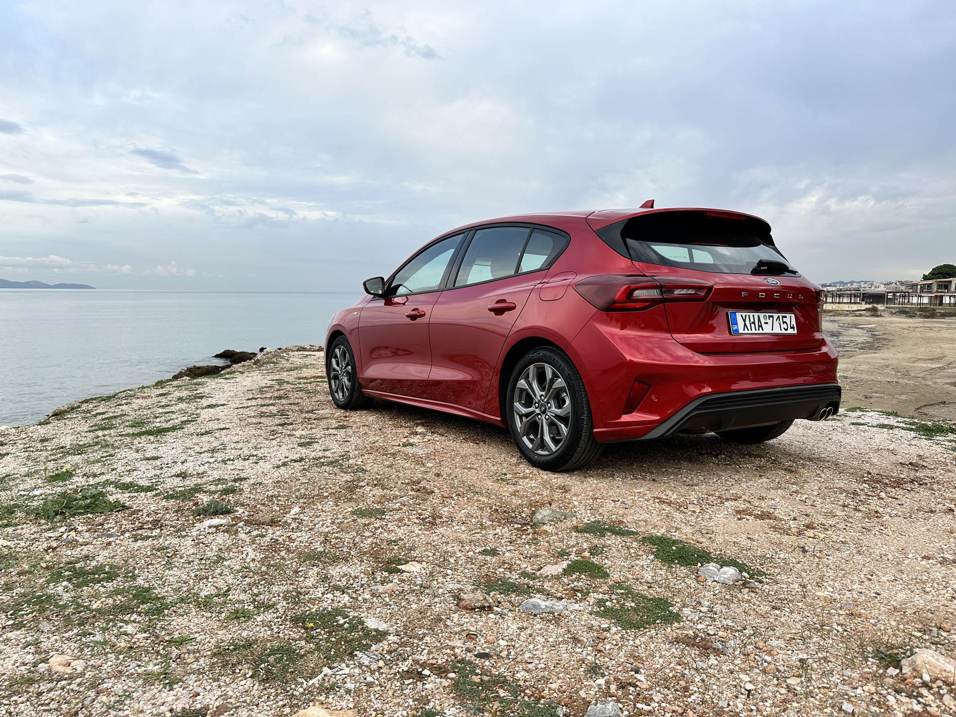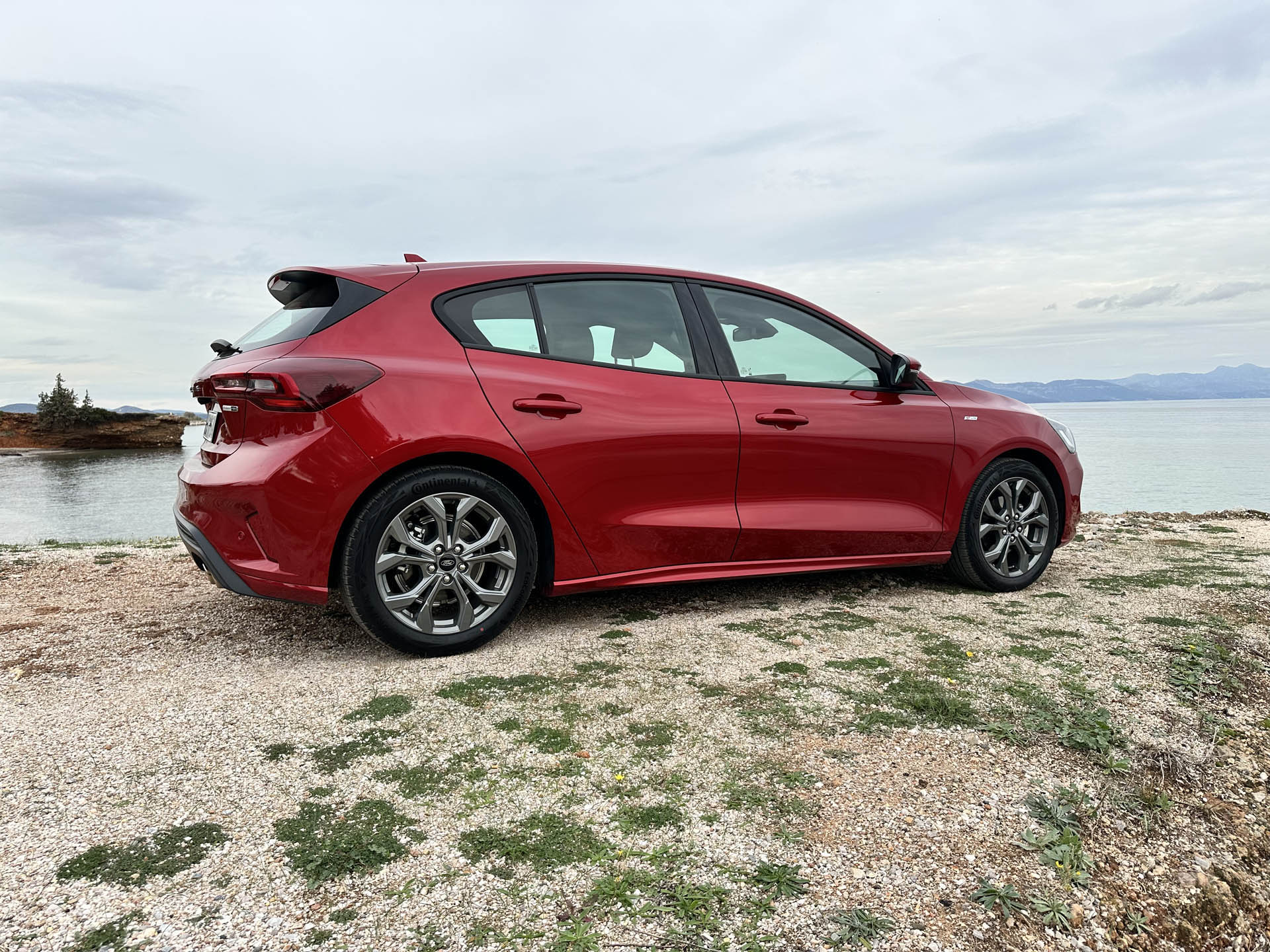 Στη σπορ όψη συμβάλλουν στο προφίλ οι πλαϊνές ποδιές, και στο πίσω μέρος η αεροτομή, ο διαχύτης και η χρωμιωμένη διπλή απόληξη εξάτμισηςΣήματα ST-Line στα εμπρός φτερά συμπληρώνουν το σκηνικό, με φόντο το μεταλλικό χρώμα «Fantastic Red» του αυτοκινήτου της δοκιμής, το οποίο κολακεύει τις γραμμές του Focus.