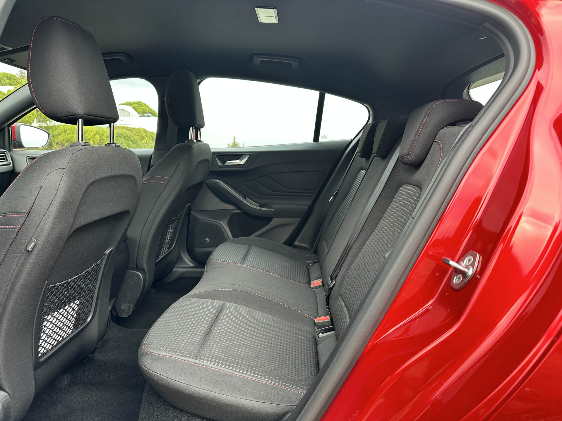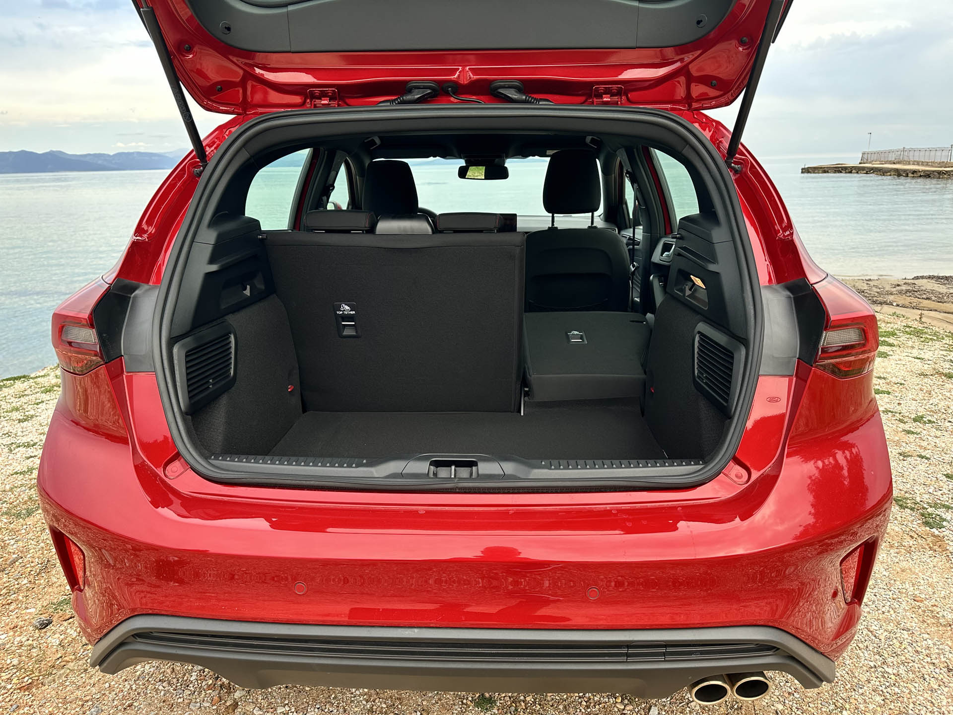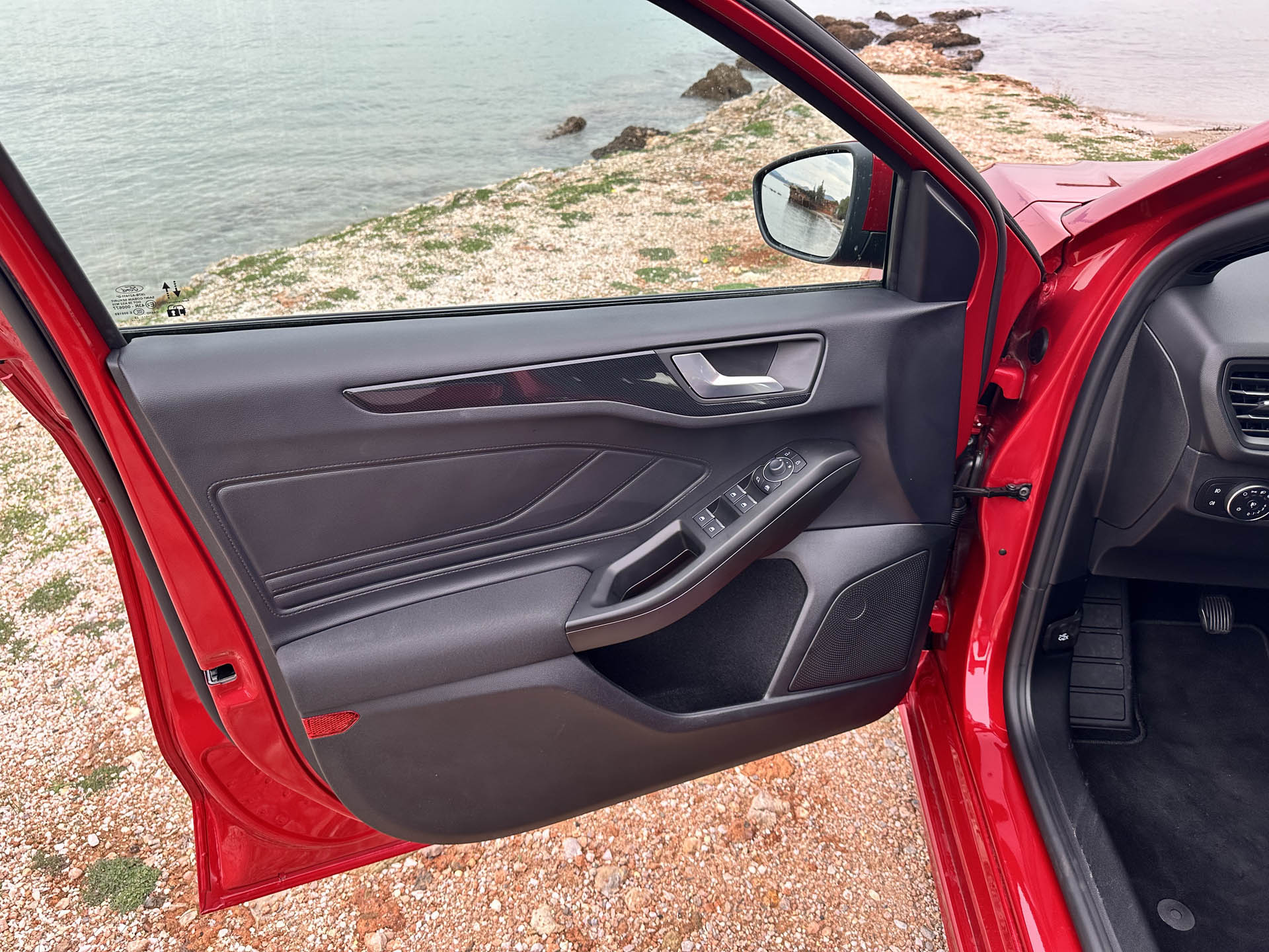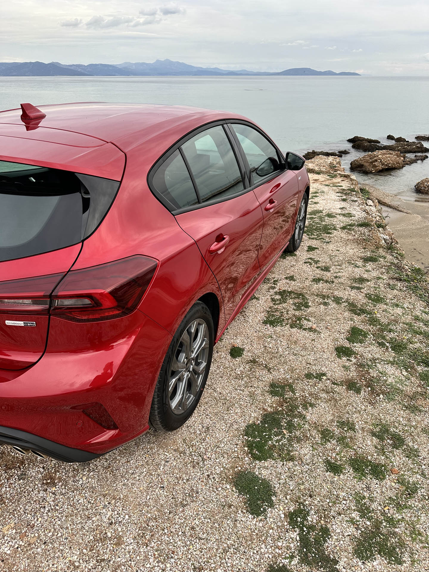 Στη σπορ όψη συμβάλλουν στο προφίλ οι πλαϊνές ποδιές, και στο πίσω μέρος η αεροτομή, ο διαχύτης και η χρωμιωμένη διπλή απόληξη εξάτμισηςΣήματα ST-Line στα εμπρός φτερά συμπληρώνουν το σκηνικό, με φόντο το μεταλλικό χρώμα «Fantastic Red» του αυτοκινήτου της δοκιμής, το οποίο κολακεύει τις γραμμές του Focus.