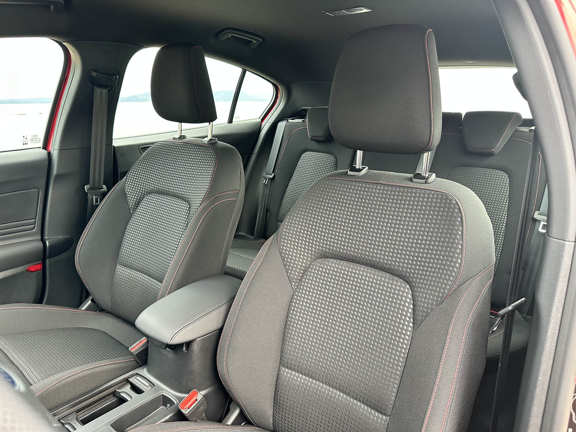 Μαλακή επένδυση καλύπτει τις περισσότερες ανώτερες επιφάνειες της καμπίνας, και μόνο προς τα κάτω υπάρχουν σκληρά πλαστικά. Κόκκινες ραφές στα καθίσματα και τον επιλογέα ταχυτήτων τονίζουν το σπορ χαρακτήρα.