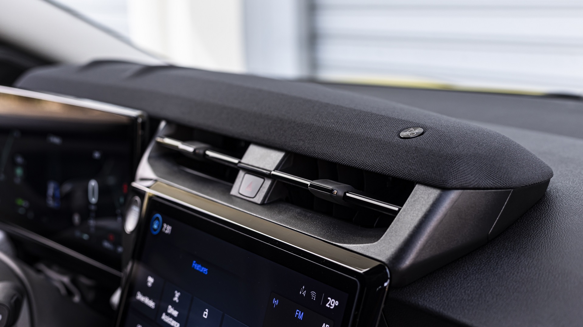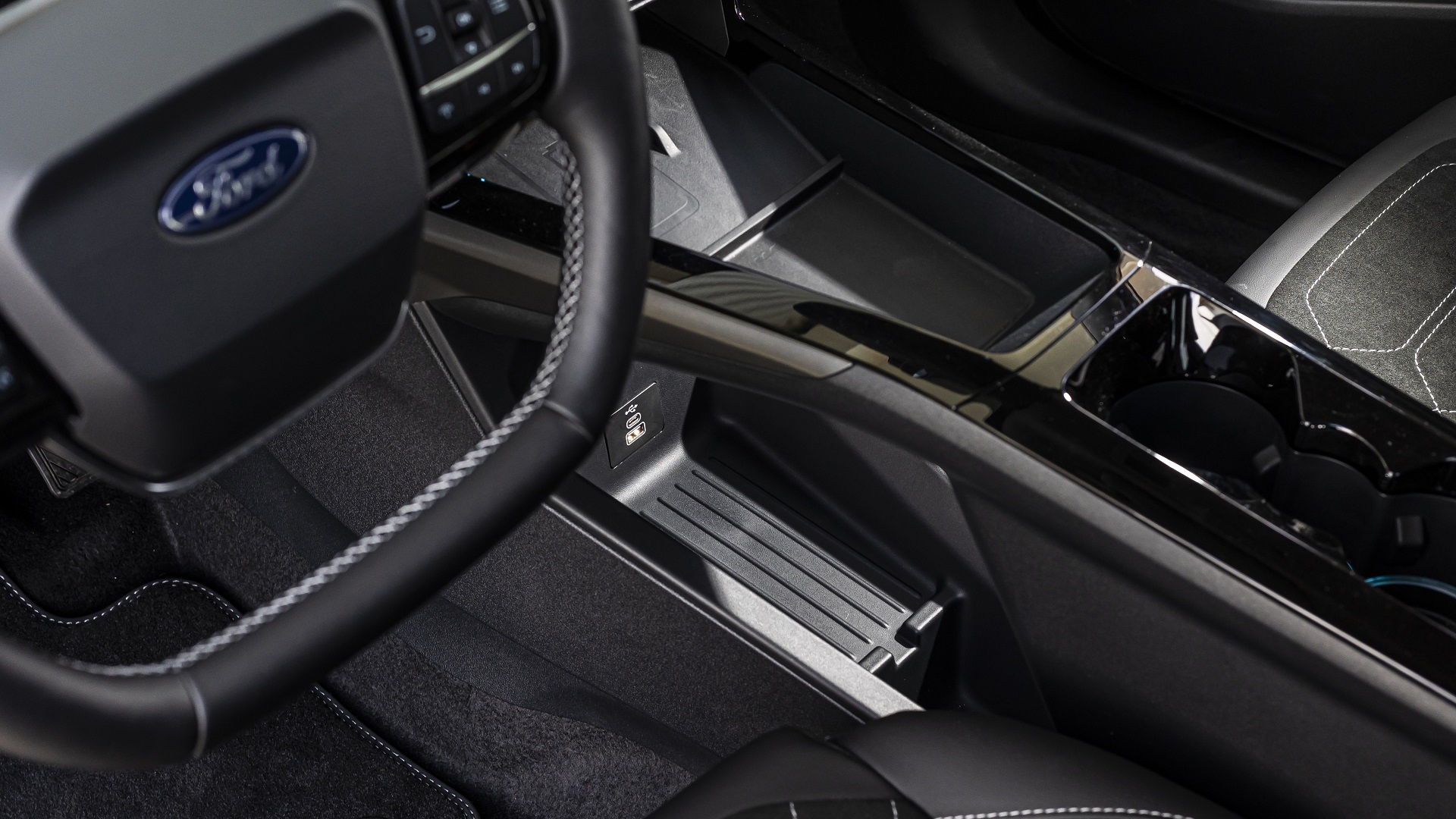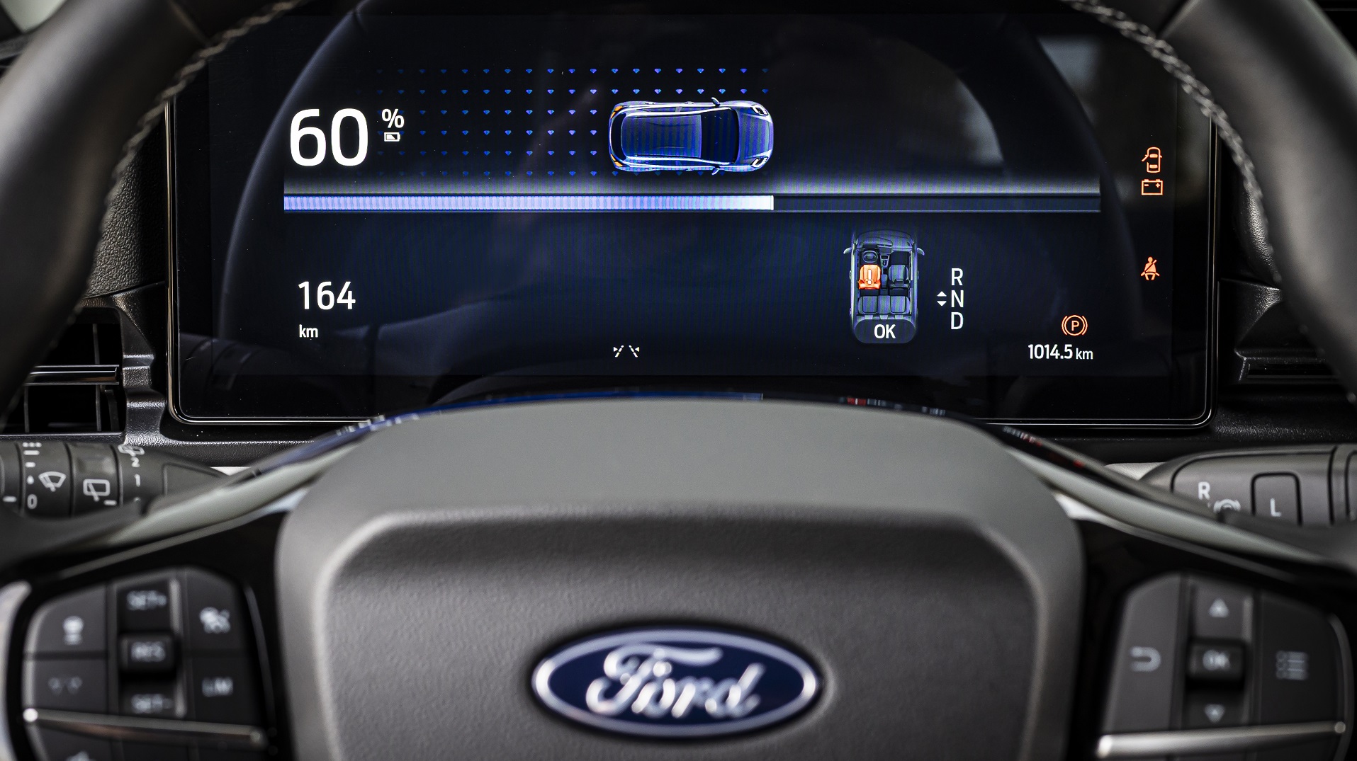 Τα υλικά είναι προσεγμένα για τα δεδομένα της κατηγορίας, ενώ πρωταγωνιστές είναι βέβαια οι δύο μεγάλες οθόνες: μία 12,8’’ για τον ψηφιακό πίνακα οργάνων και μία αφής 12’’ στο κέντρο του ταμπλό για το infotainment SYNC 4 της Ford.