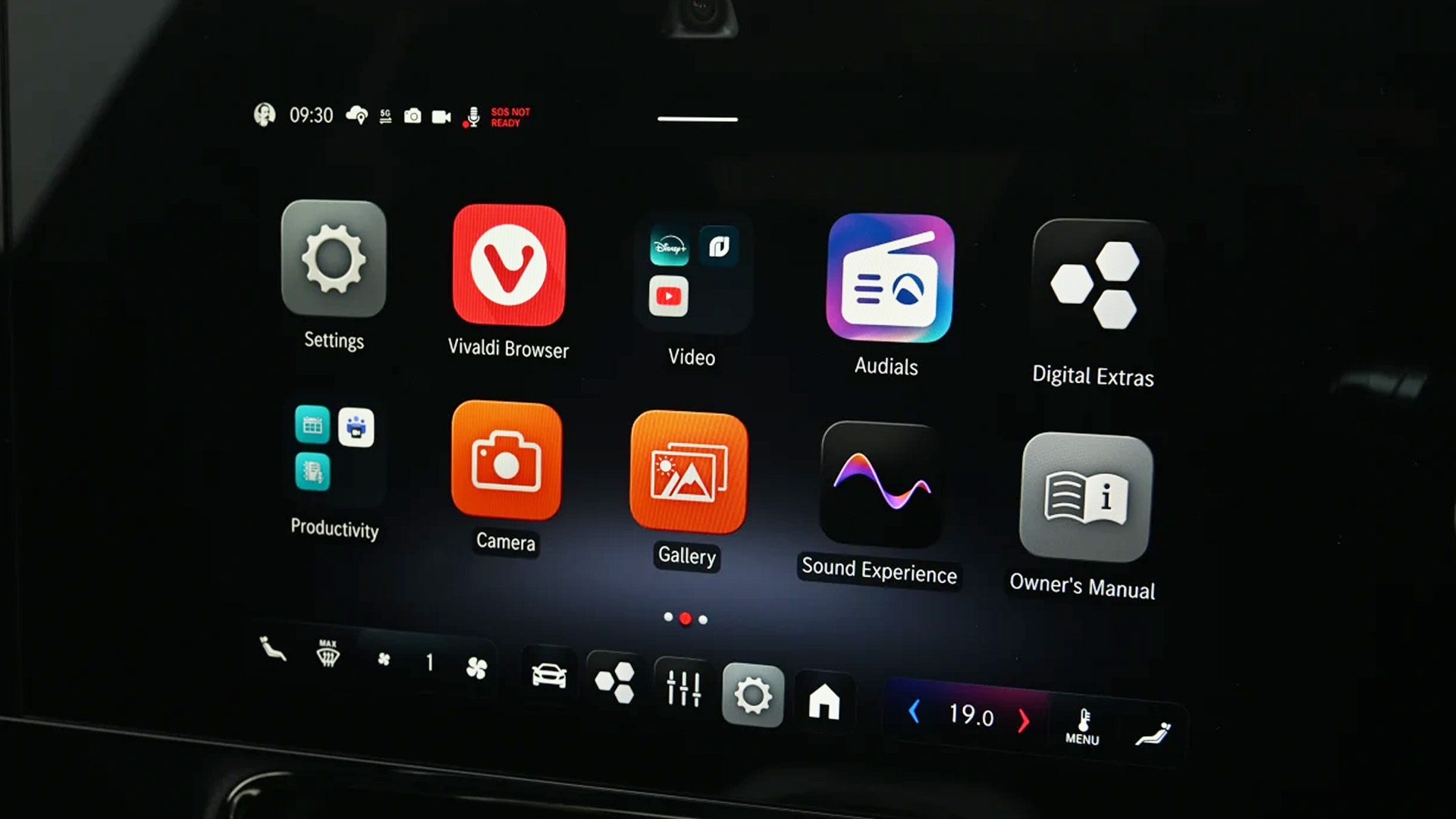 Υπάρχουν επιπλέον χειριστήρια, όπως η μπάρα κύλισης για την ένταση του ήχου και οι επιλογές των προγραμμάτων οδήγησης σε ένα μαύρο πάνελ στη βάση της οθόνης, δίπλα στη βάση ασύρματης φόρτισης κινητού.