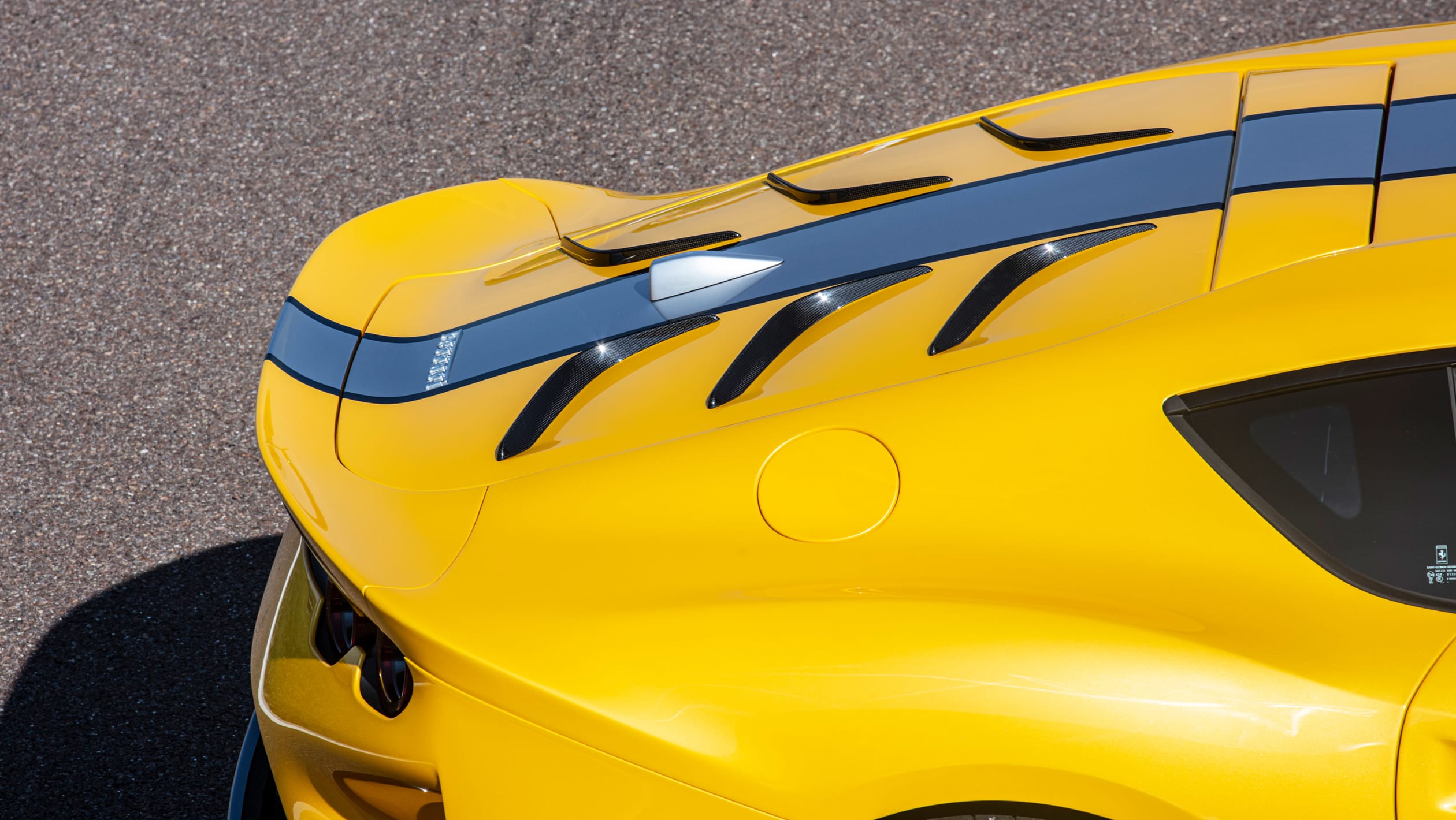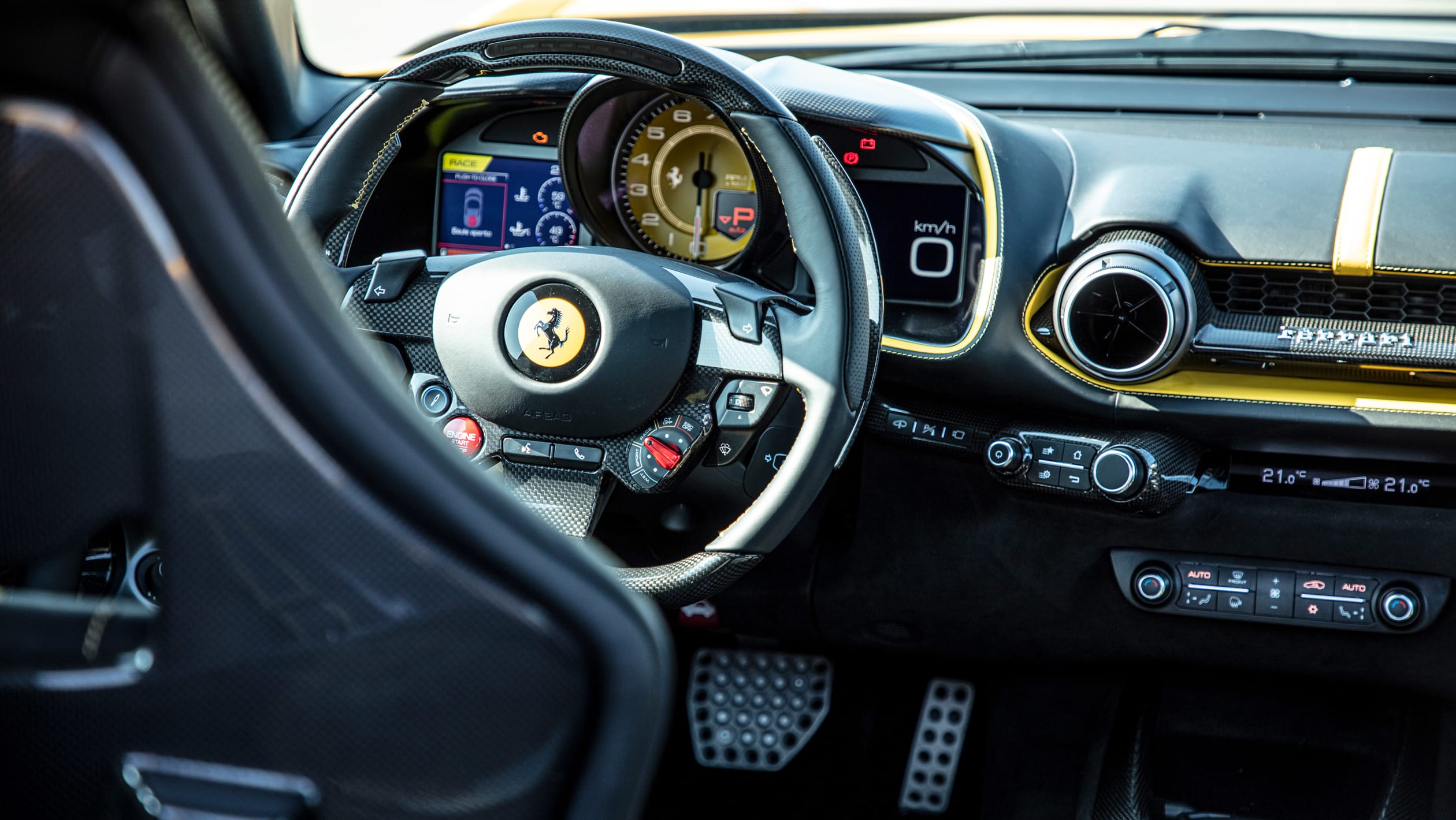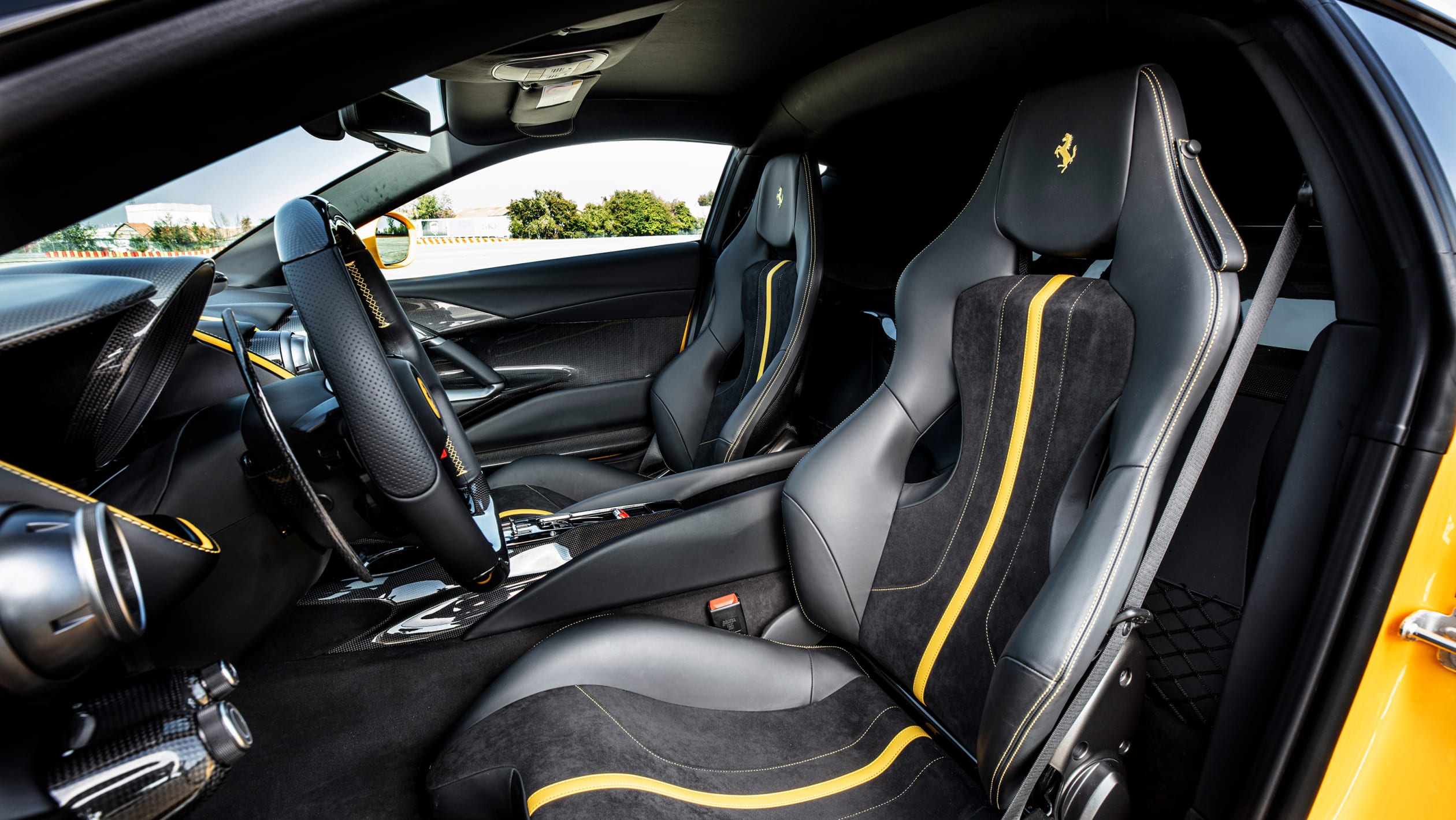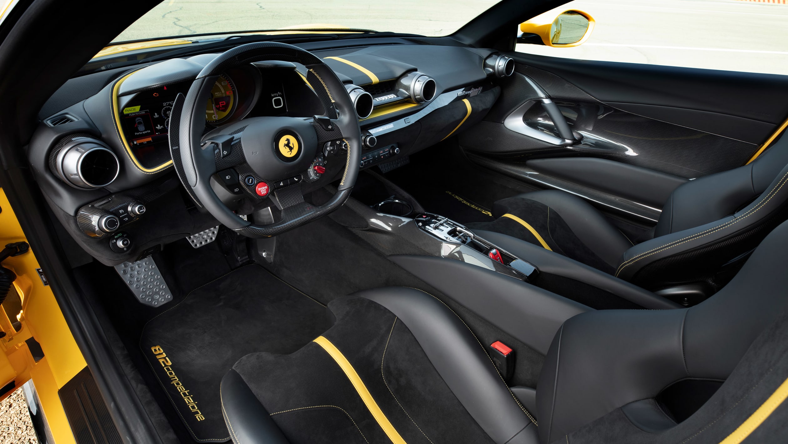 Η Competizione επιβάλλεται και με την εμφάνισή της. Όταν στέκεσαι δίπλα της τρομάζεις λόγω του μεγέθους της, αλλά και της δύναμης που κρύβει κάτω από το εμπρός καπό της. Στο εσωτερικό το περιβάλλον είναι οικείο σε όσους έχουν οδηγήσει της 812 Superfast, με τις οθόνες πολλαπλών λειτουργιών και το στροφόμετρο, ωστόσο, ο επιλογέας ταχυτήτων είναι νέος. Οι επενδύσεις Alcantara φαίνεται να καλύπτουν σχεδόν κάθε επιφάνεια και όπου δεν το κάνουν θα βρείτε ανθρακονήματα που κάνουν ακόμα πιο σκληροπυρηνική την ατμόσφαιρα.