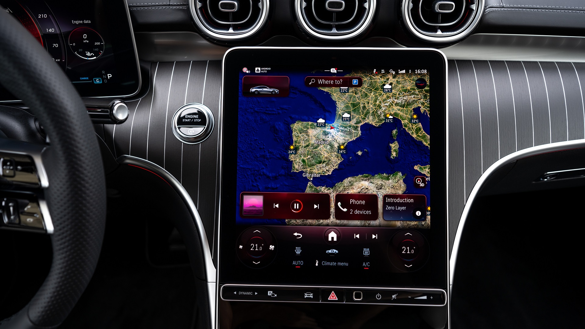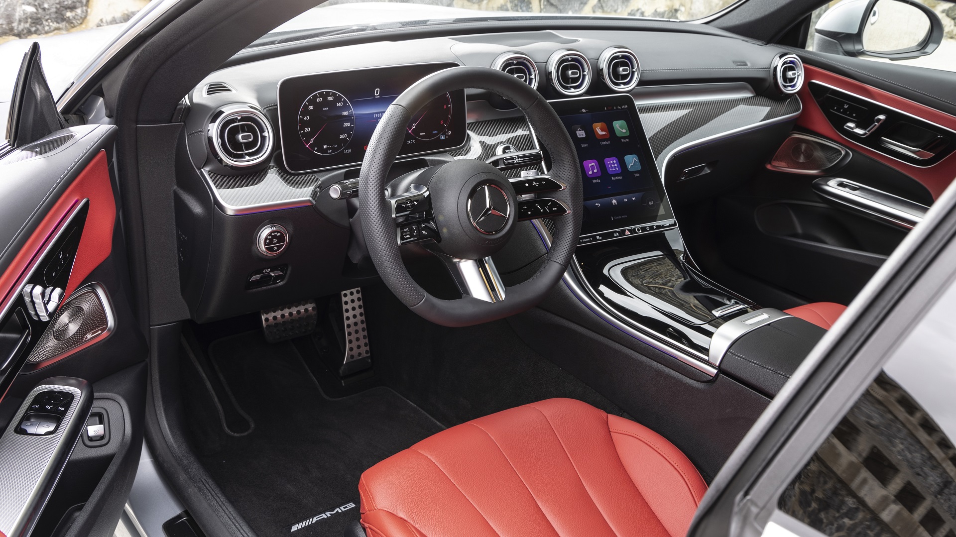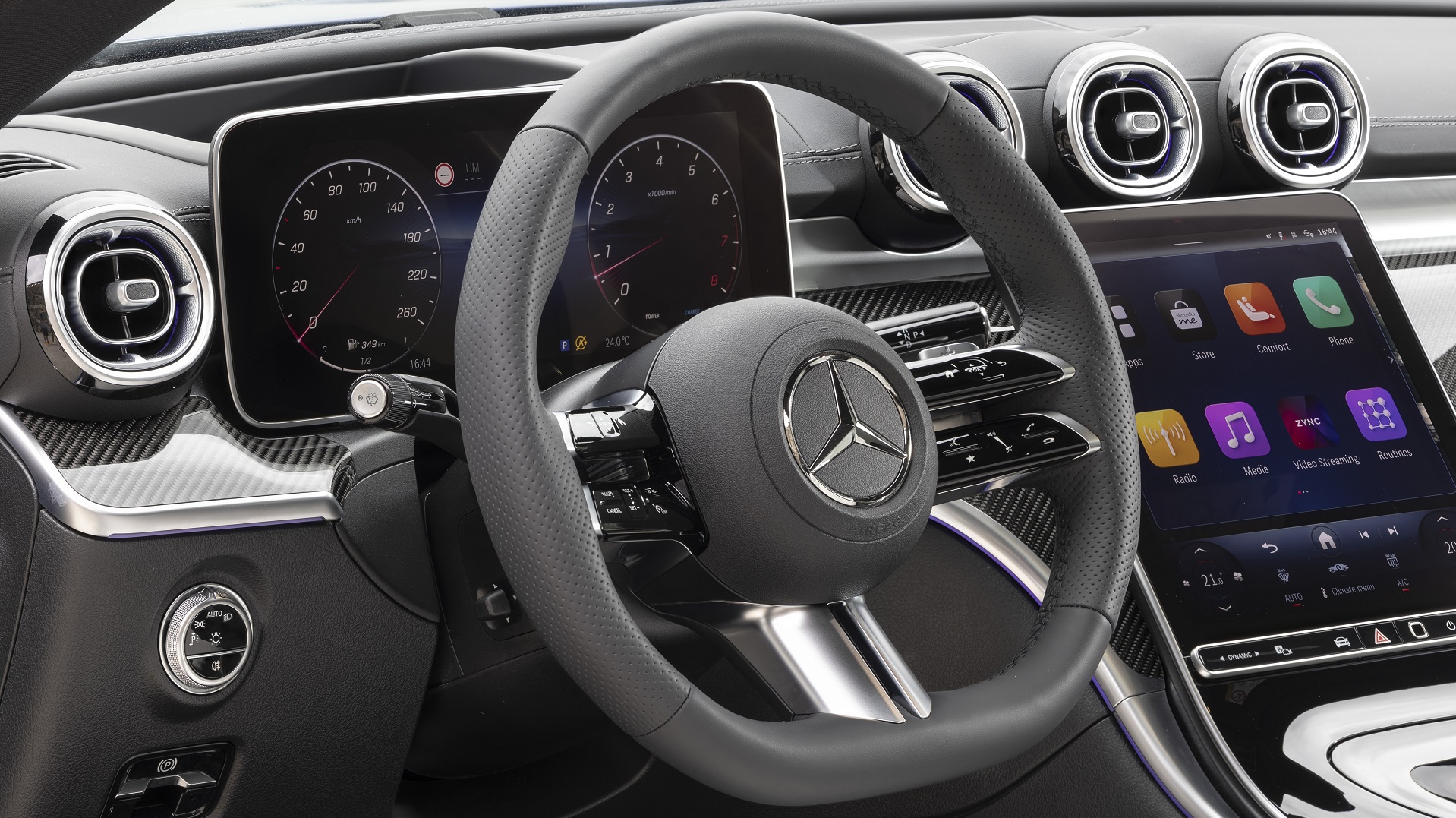 Στο εμπρός μέρος ξεχωρίζει ο πλήρως ψηφιακός πίνακας οργάνων 12,3 ιντσών, η κάθετη κεντρική οθόνη αφής 11,9 ιντσών με κλίση προς τον οδηγό, όπου φιλοξενείται το τελευταίας γενιάς σύστημα πολυμέσων MBUX, και ο ατμοσφαιρικός φωτισμός με 64 χρώματα. Προαιρετικά διαθέσιμο είναι και το σύστημα ήχου Burmester 3D, με επιπλέον δύο ηχεία στο ύψος των προσκεφάλων που αναβαθμίζουν την ηχητική εμπειρία. Συνολικά το σύστημα αποτελείται από 17 ηχεία!