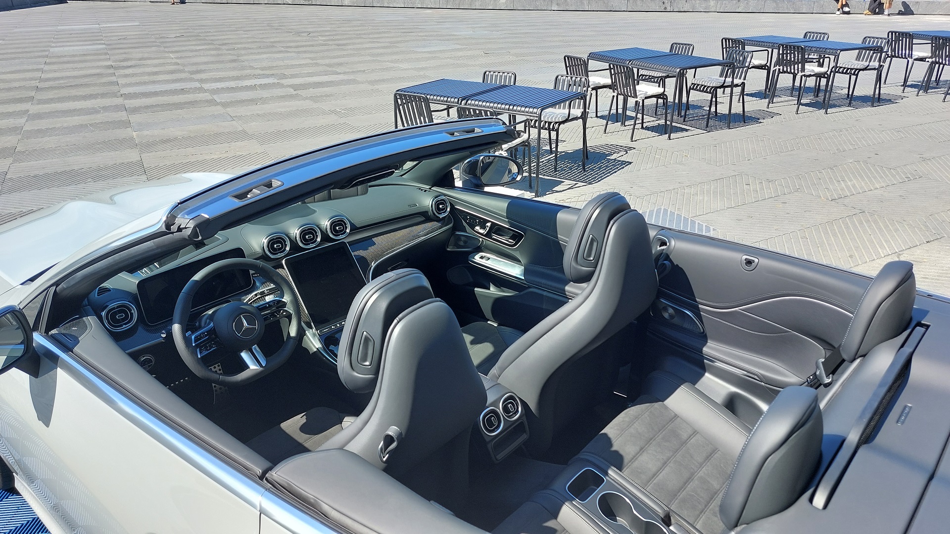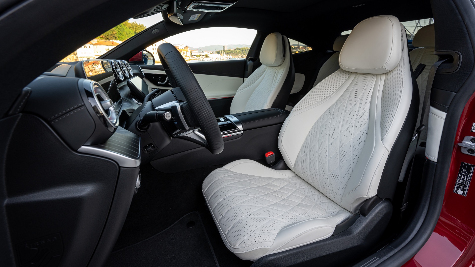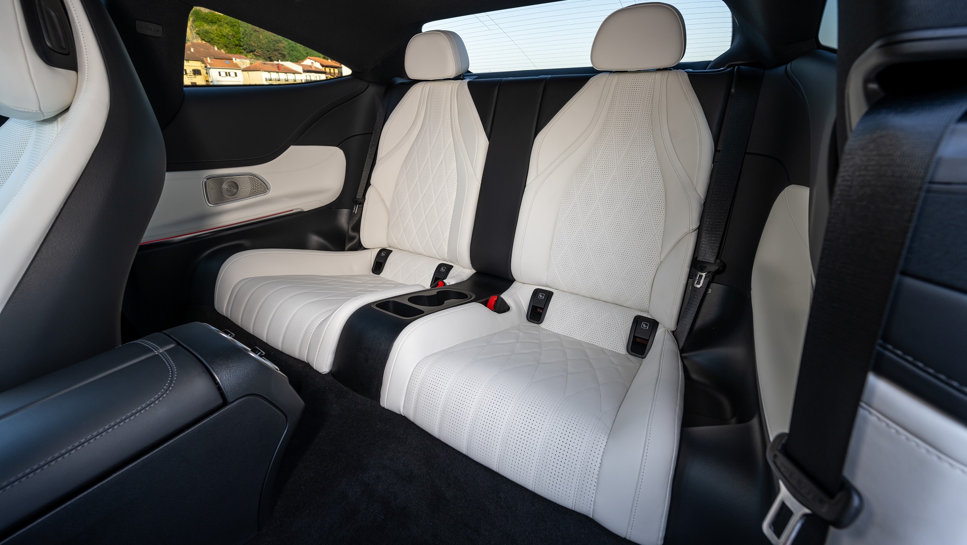 Κομψή λεπτομέρεια: για πρώτη φορά σε Mercedes-Benz, για την επιβίβαση στις πίσω θέσεις, τα μπροστινά καθίσματα δεν μετακινούνται προς τα εμπρός με μοχλό, αλλά με θηλιά από δέρμα Nappa που βρίσκεται στο επάνω άκρο της πλάτης. Γενικά, η CLE προσφέρει χώρους αντίστοιχους της απερχόμενης E-Class Coupe και αρκετά μεγαλύτερους συγκριτικά με την μικρότερη C-Class Coupe.