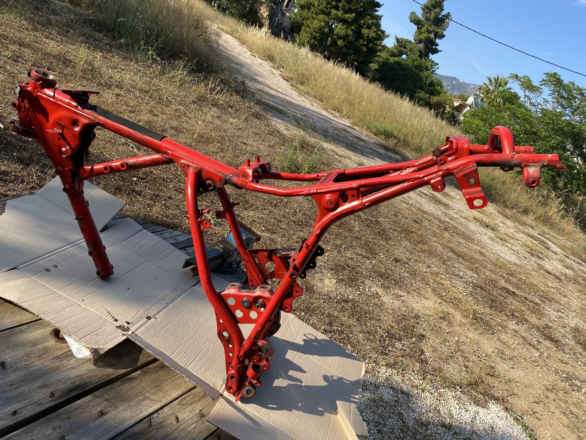 Ο γυμνός σκελετός της, οδηγήθηκε προς αμμοβολή και στη συνέχεια προς ηλεκτροστατική βαφή. Οι τροχοί μαζί με τα κέντρα τους λύθηκαν, τα στεφάνια έγιναν χρυσά με ειδική ανοδίωση αλουμινίου, οι ακτίνες αλλάχθηκαν με καινούργιες γνήσιες της Yamaha. Ανακατασκευάστηκαν επίσης οι εμπρός αναρτήσεις με καινούργιες τσιμούχες, ξύστρες, αντιτριβικά, λάδια στα καλάμια, ενώ ίδιες εργασίες έγιναν στο πίσω μονό αμορτισέρ.