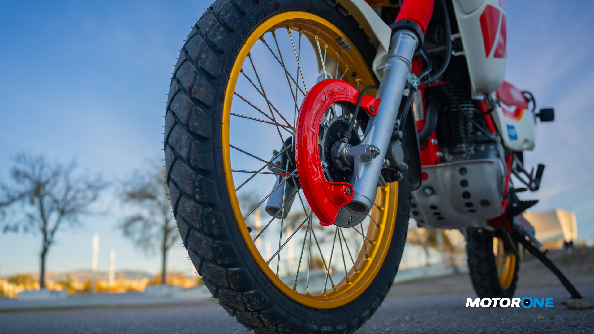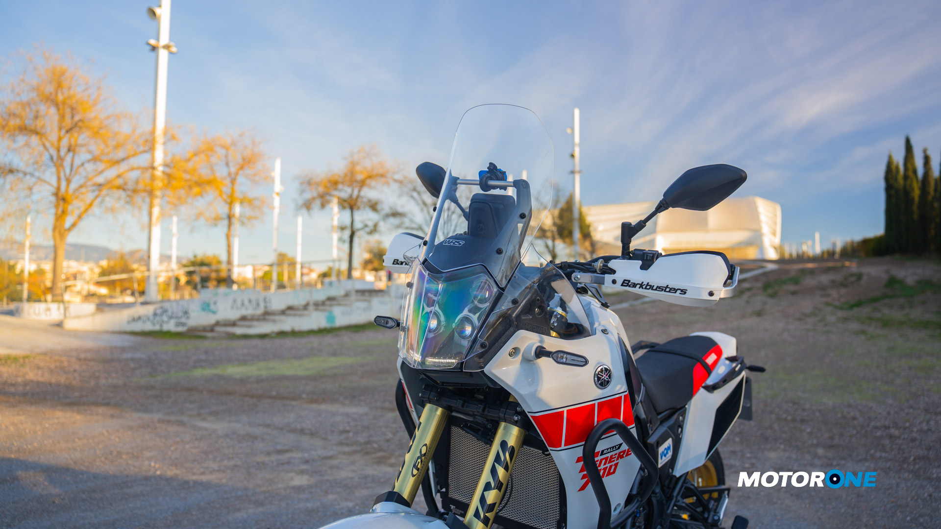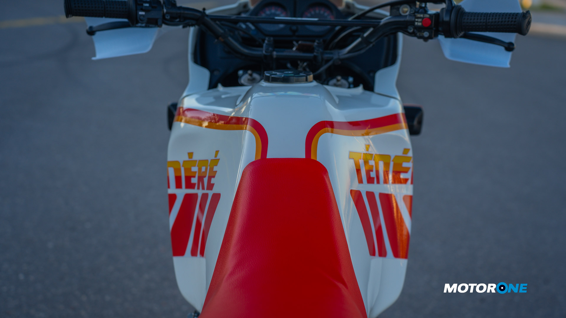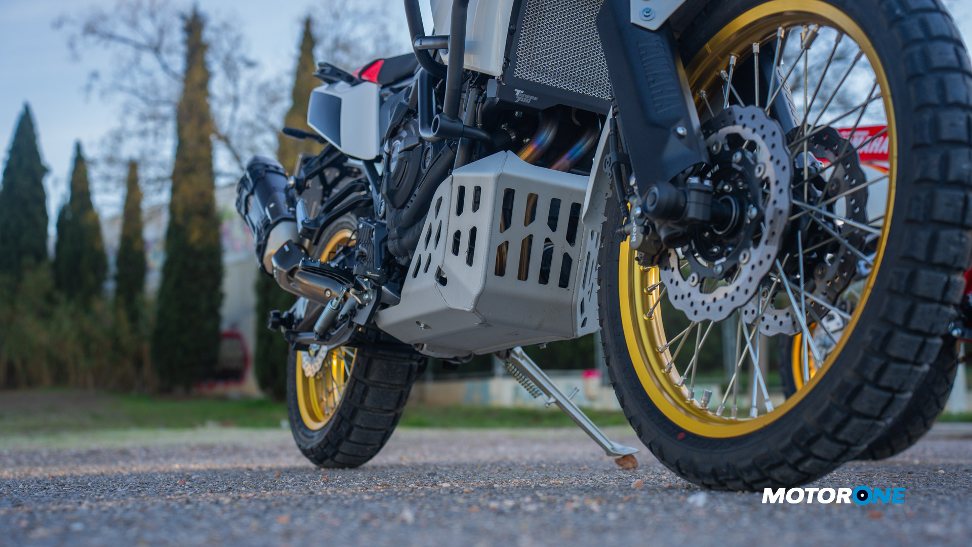 Το σύνολο των τροχών με τα χρυσά τους στεφάνια έδειξε πάρα πολύ ωραία και μας θύμισε τις εργοστασιακές μοτοσικλέτες που έτρεχαν στο Dakar. Έτσι ακριβώς άλλωστε βγαίνει σήμερα και το σύγχρονο Tenere 700 Rally, σε άσπρο – κόκκινο με χρυσά στεφάνια. Οι ολοκαίνουργιες κόκκινες φυσούνες στα πιρούνια, μαζί με το νέο γνήσιο μπροστινό χαμηλό φτερό, ολοκλήρωσαν μπροστά το εντυπωσιακό μηχανολογικό σύνολο.