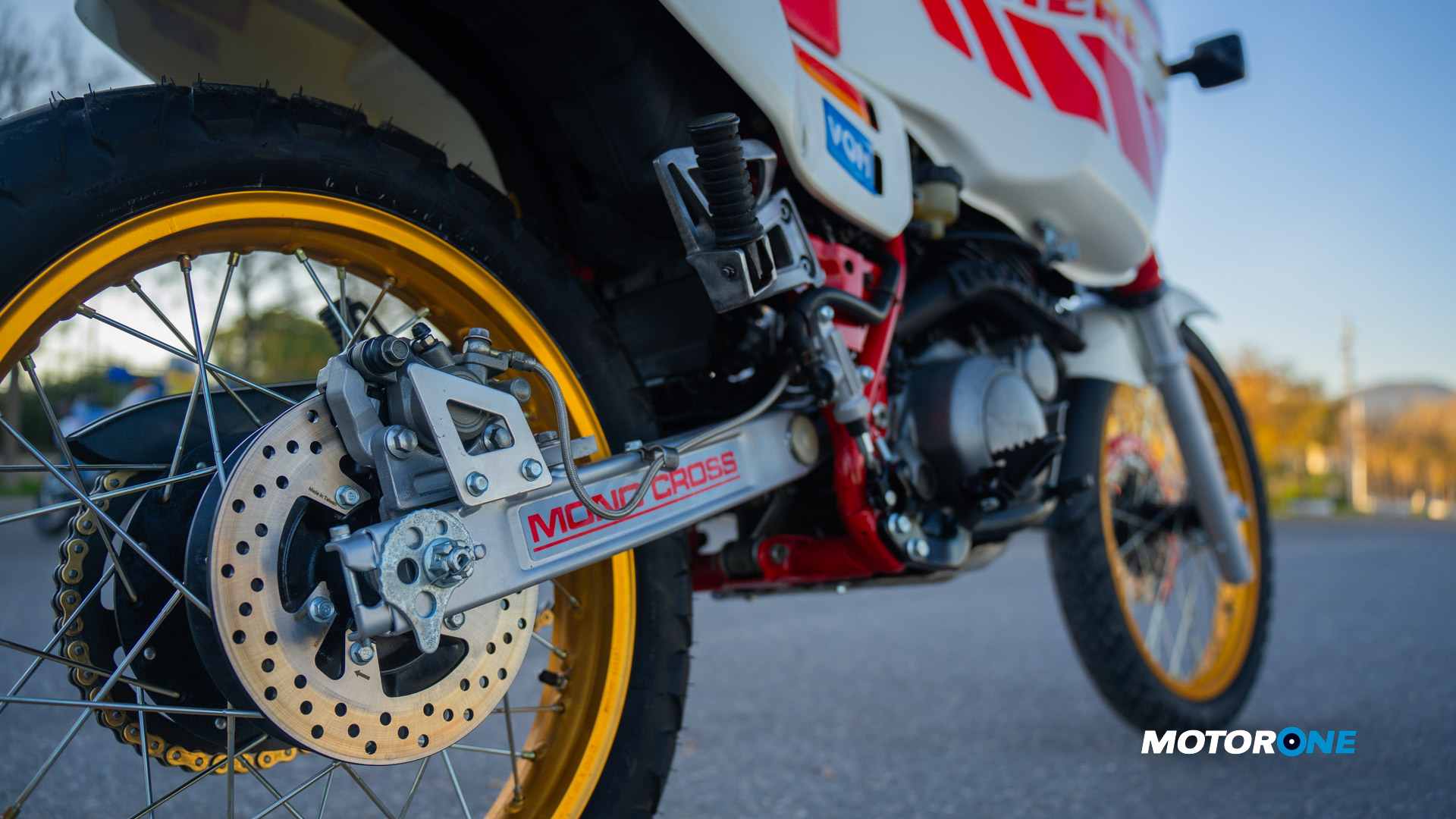 Στο μοχλικό σύστημα και στο ηλεκτροστατικά βαμμένο ψαλίδι τοποθετήσαμε καινούργια ρουλεμάν μαζί με τους γνήσιους πείρους τους. Αλλάχθηκαν ακόμη το πίσω δισκόφρενο – το μπροστά παρέμεινε το ίδιο αφού ήταν σε άριστη κατάσταση – και αγοράστηκαν καινούργια τακάκια φρένων για μπροστά και πίσω. Με εξίσου μεγάλη επιμέλεια επεξεργαστήκαμε ολόκληρη τη γνήσια εξάτμιση, από τους λαιμούς της μέχρι το τελικό της τμήμα.