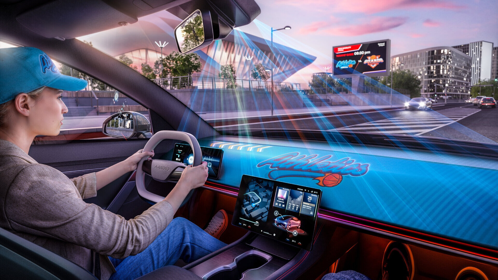 Παράλληλα, στο πρωτότυπο μοντέλο που θα παρουσιάσει η AUMOVIO στο περίπτερό της στο CES 2026, θα ενσωματώνεται και το νέο σύστημα «Surface Projection». Αξιοποιεί έναν ενσωματωμένο προτζέκτορα στο πάνω μέρος του παρμπρίζ, για να προβάλλει εικόνες απευθείας στο ταμπλό, μετατρέποντάς το σε έναν τεράστιο… καμβά ζωγραφικής! Ανάλογα με την συνθήκη, το σύστημα μπορεί να προβάλλει διακοσμητικά μοτίβα, ατμοσφαιρικά χρώματα και εφέ φωτισμού, πληροφορίες για τον οδηγό, διακριτικές ενδείξεις πλοήγησης ή ειδοποιήσεις από συστήματα υποβοήθησης.