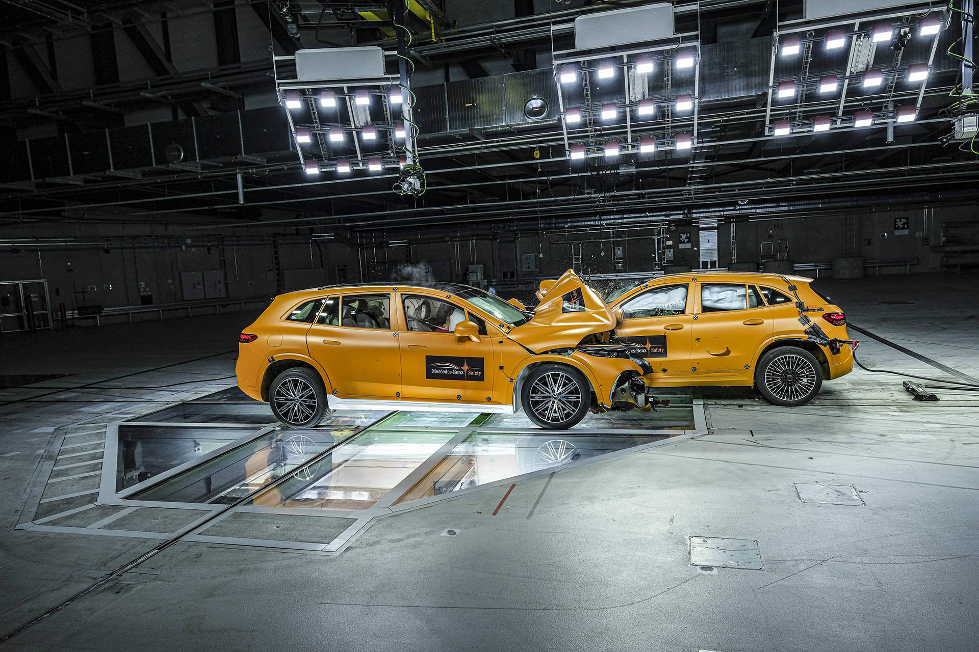 Με την πρώτη δημόσια δοκιμή πρόσκρουσης στον κόσμο στην οποία συμμετείχαν δύο αμιγώς ηλεκτρικά οχήματα, η Mercedes-Benz υπερέβη όχι μόνο τις νομικές απαιτήσεις αλλά και τις απαιτήσεις του οργανισμού αξιολόγησης της ασφάλειας των αυτοκινήτων που κυκλοφορούν στο δρόμο. Το Euro NCAP ορίζει μια δοκιμή μετωπικής σύγκρουσης με τη χρήση ενός καροτσιού βάρους 1.400 κιλών με ένα φράγμα από κυψελωτή δομή αλουμινίου που αναπαράγει το εμπρός τμήμα ενός άλλου οχήματος.